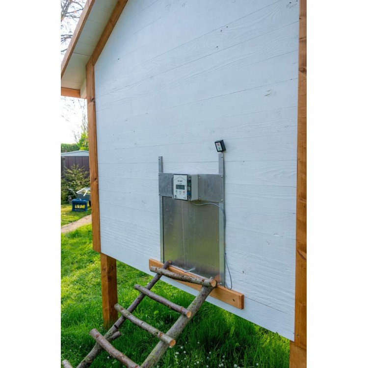 - Montaż jest szybki i łatwy: w zestawie znajdują się akcesoria do szybkiego montażu. Wystarczy przymocować urządzenie do zewnętrznej strony kurnika, podłączyć kabel do drzwiczek i ustawić preferowany tryb – timer, czujnik światła lub kombinację obu.