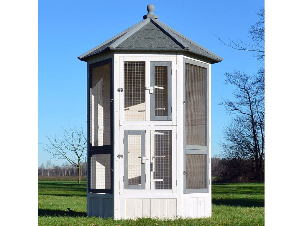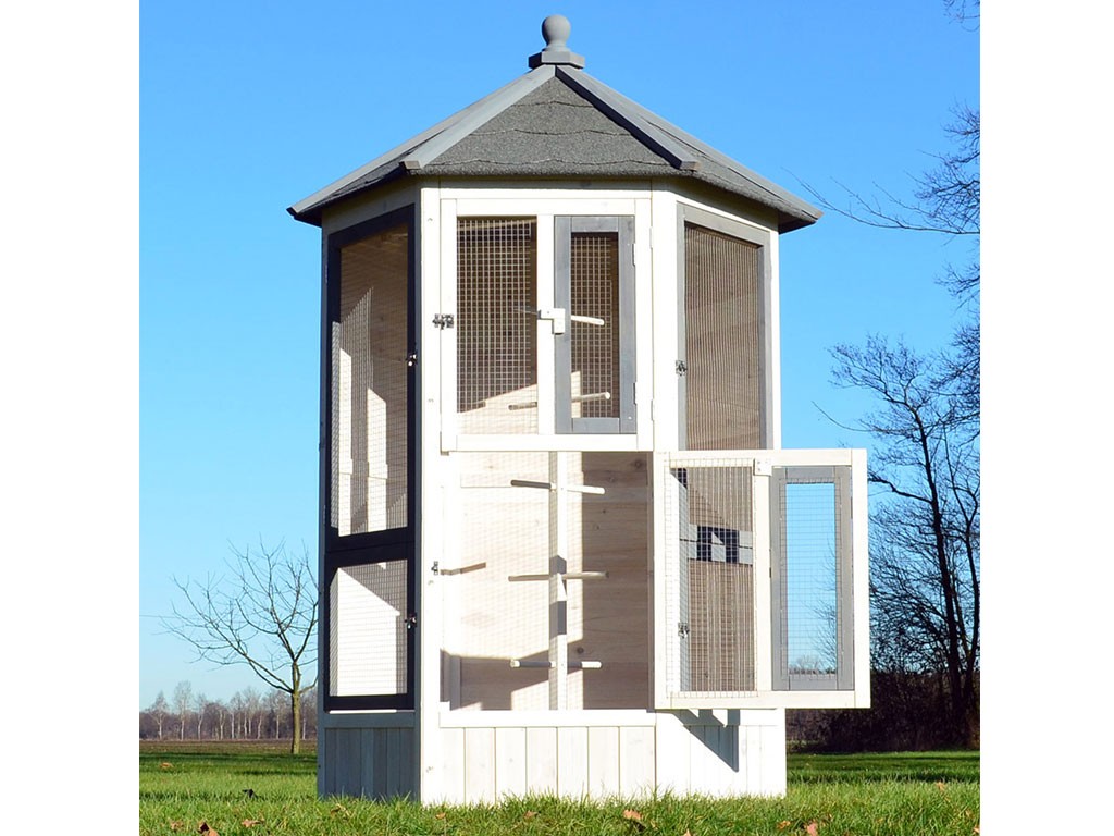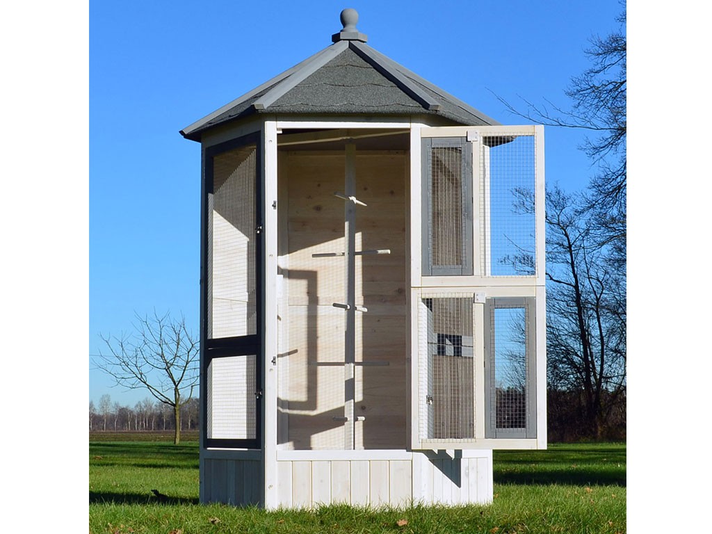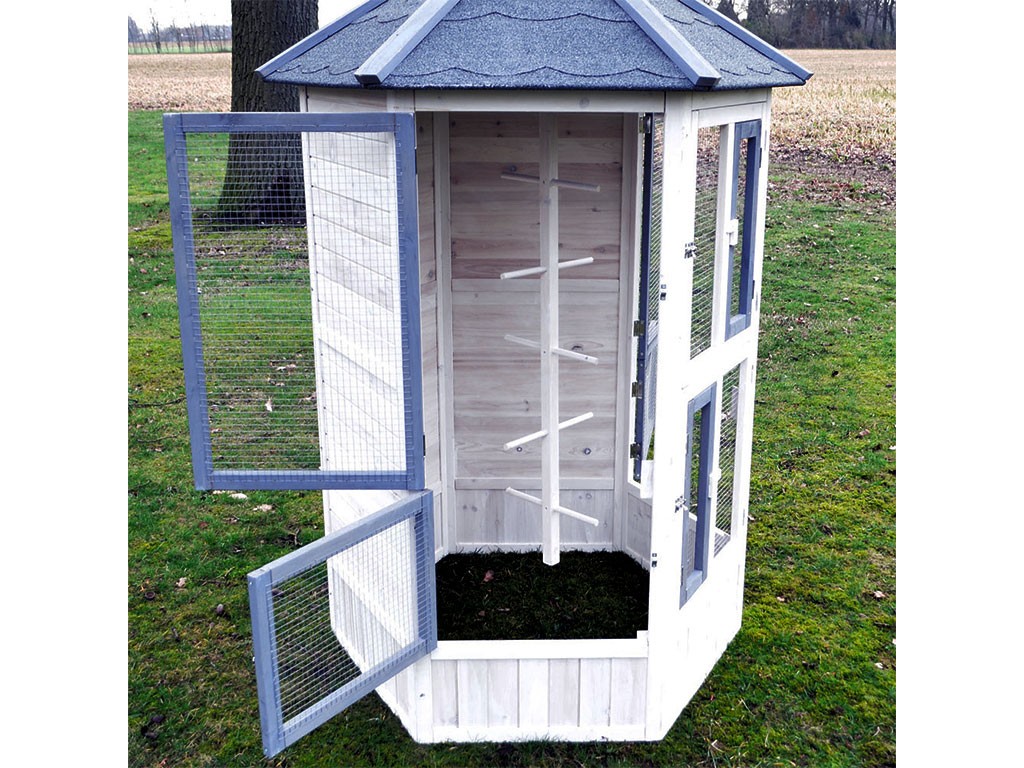 Woliera dla ptaków wykonana z litego drewna, lakierowane drewno sosnowe, dach bitumiczny, 6 otwieranych drzwiczek, 5 grzęd na drążku do wieszania, stylowy biały kolor, wymiary 100x100x183cm.