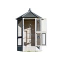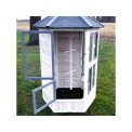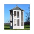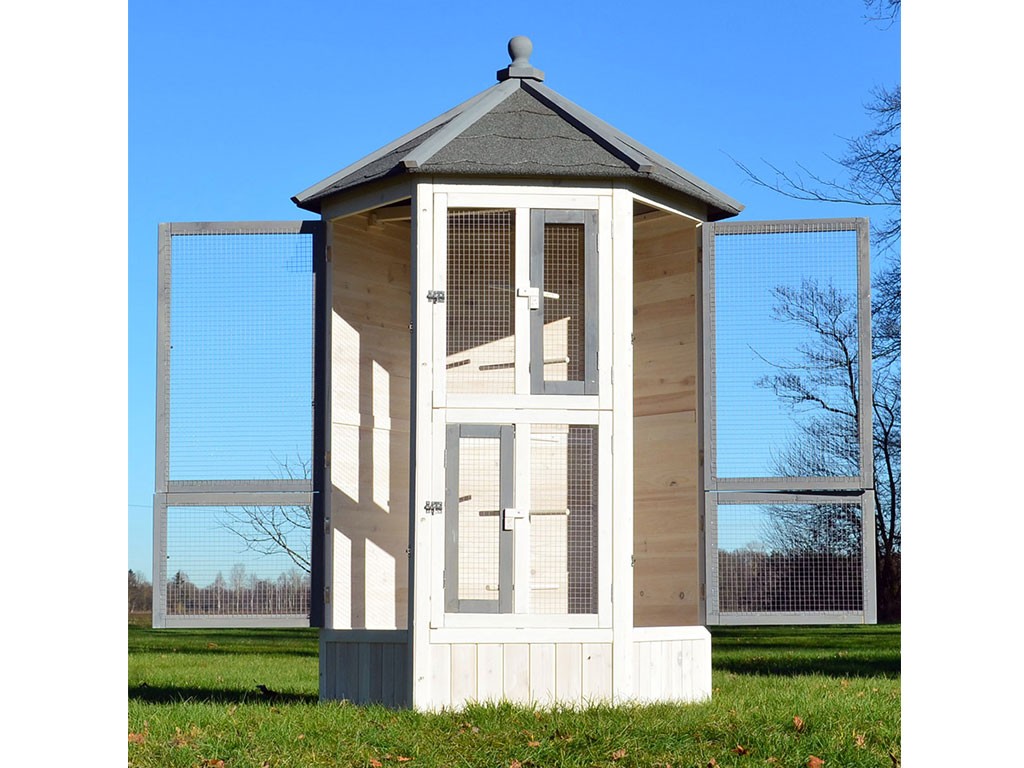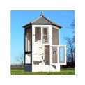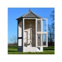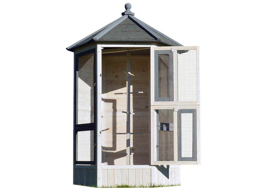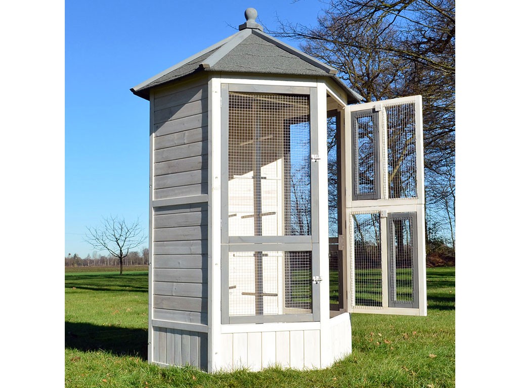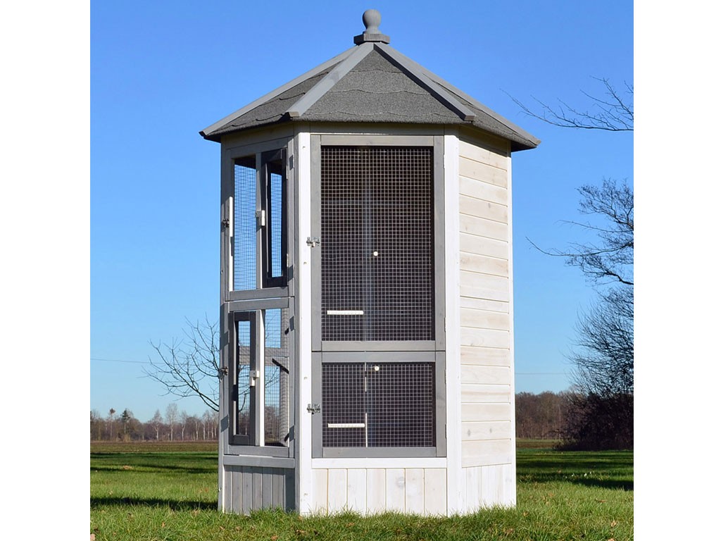 Woliera dla ptaków wykonana z litego drewna, lakierowane drewno sosnowe, dach bitumiczny, 6 otwieranych drzwiczek, 5 grzęd na drążku do wieszania, stylowy biały kolor, wymiary 100x100x183cm.