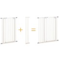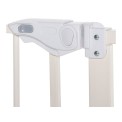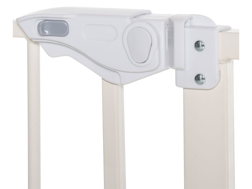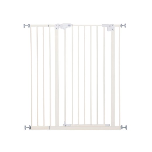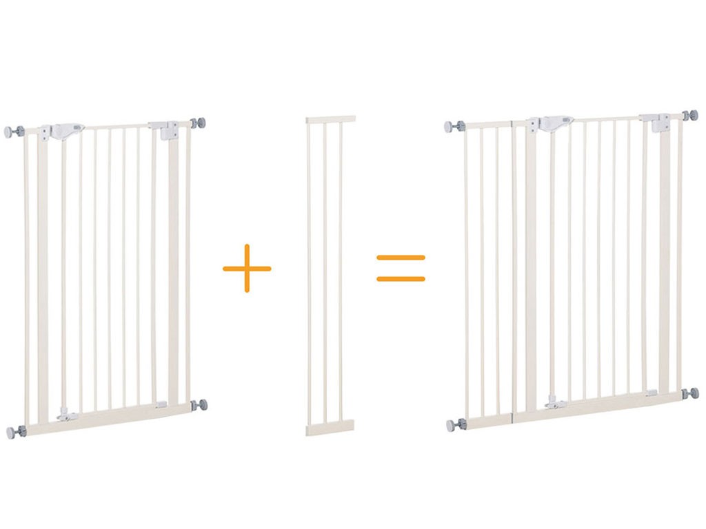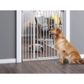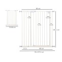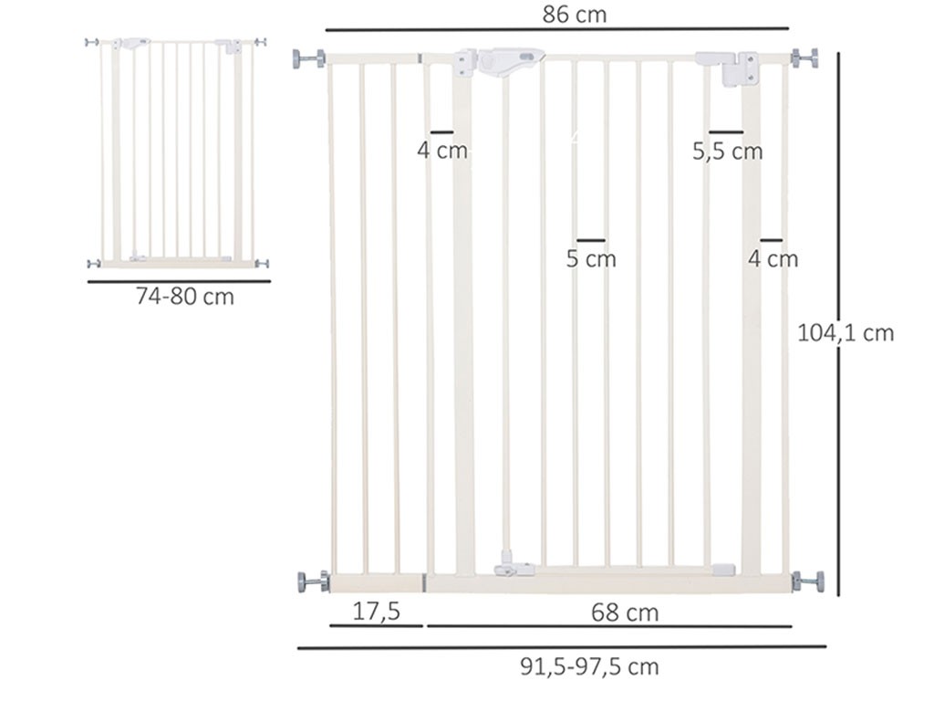 Bramka zabezpieczająca dla psa wykonana jest z wytrzymałej stalowej ramy w eleganckim białym wykończeniu , które z łatwością dopasuje się do każdego wnętrza. Zawiasy i punkty mocowania do ściany wykonane są z trwałego tworzywa sztucznego, co zapewnia wytrzymałość i trwałość. Odległość między prętami bramki wynosi 5,7 cm , co jest idealne, aby uniemożliwić przedostawanie się mniejszych psów i zapewnić odpowiednią wentylację. Drzwi są oddalone od ramy o 5,5 cm , co pozwala na łatwe otwieranie i zamykanie bez ryzyka zablokowania. W przypadku przestrzeni powyżej 82 cm zalecamy użycie dodatkowych przedłużek, aby zapewnić stabilne mocowanie bramki. Całkowite wymiary bramki wynoszą od 74 do 97,5 cm szerokości i 104 cm wysokości, co pozwala na jej dopasowanie do różnych przestrzeni w domu.