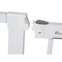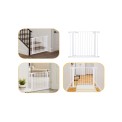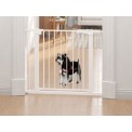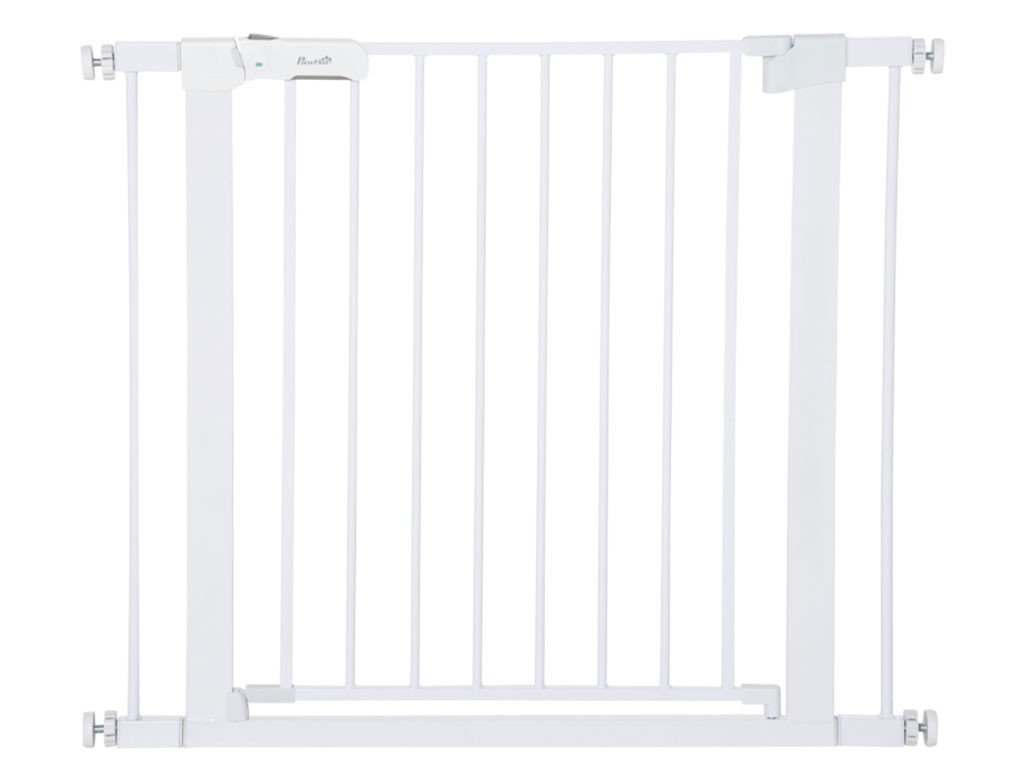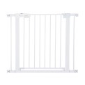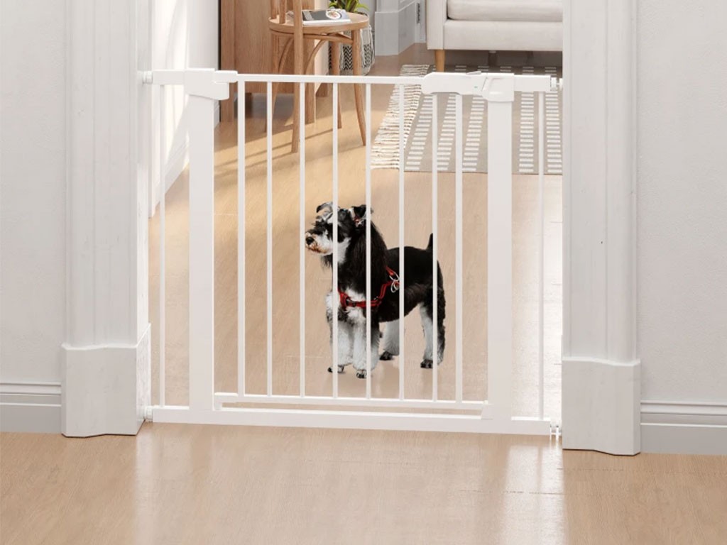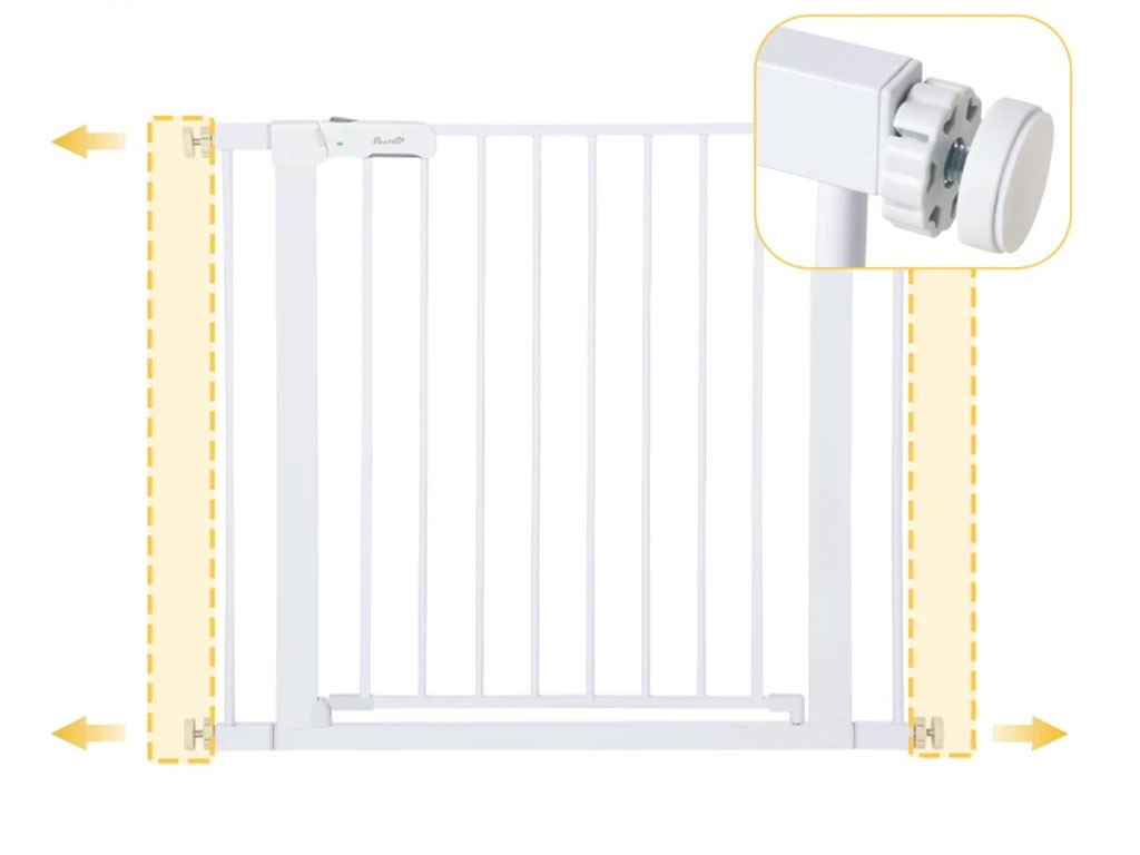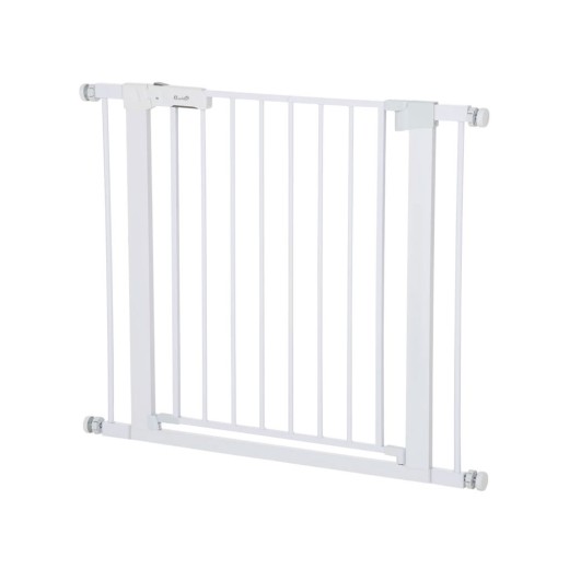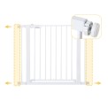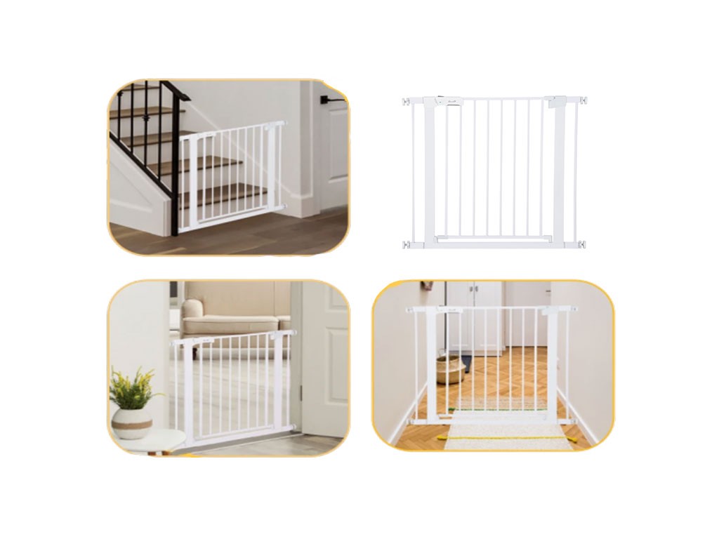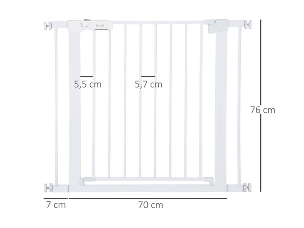 Bramka dla psa wykonana jest z solidnej stalowej ramy w eleganckim białym wykończeniu , które z łatwością dopasuje się do każdego wnętrza. Zawiasy i punkty mocowania do ściany wykonane są z trwałego tworzywa sztucznego, co zapewnia wytrzymałość i trwałość. Odległość między prętami bramki wynosi 5,7 cm , co jest idealne, aby uniemożliwić przedostawanie się mniejszych psów i zapewnić odpowiednią wentylację. Drzwi są oddalone od ramy o 5,5 cm , co pozwala na łatwe otwieranie i zamykanie bez ryzyka zablokowania. W przypadku przestrzeni powyżej 82 cm zalecamy użycie dodatkowych przedłużek, aby zapewnić stabilne mocowanie bramki. Wymiary całkowite bramki wynoszą od 75 do 96 cm szerokości i 76 cm wysokości, co pozwala na dopasowanie jej do różnych przestrzeni w domu.
