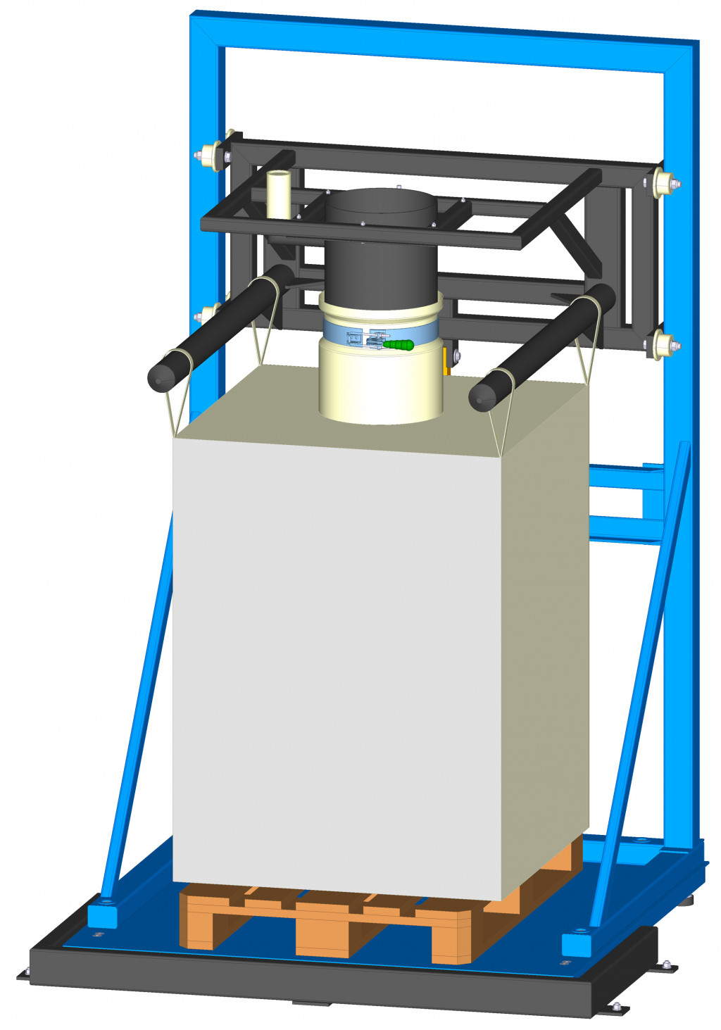 W porównaniu do typu BV1, waga do big-bagów serii BV2 wyposażona jest w podnośnik mechaniczny umożliwiający pionowy ruch ramy mocującej z bolcami.