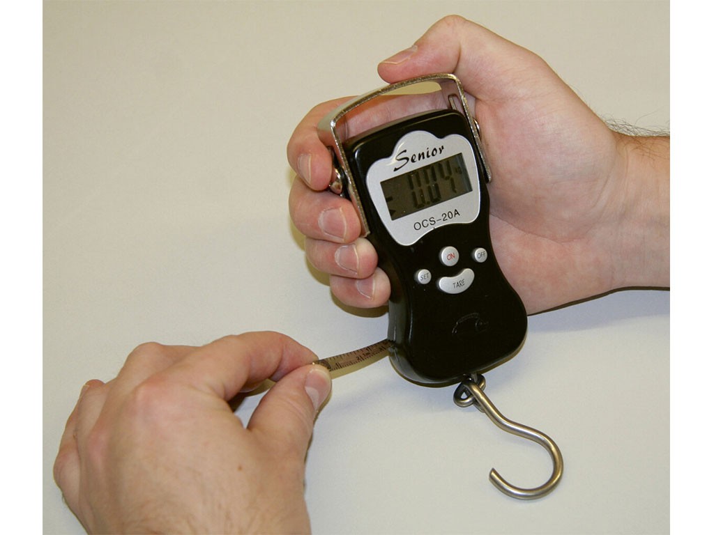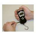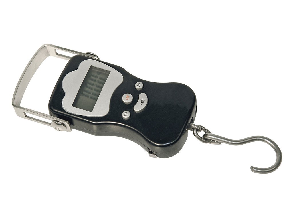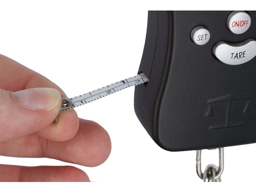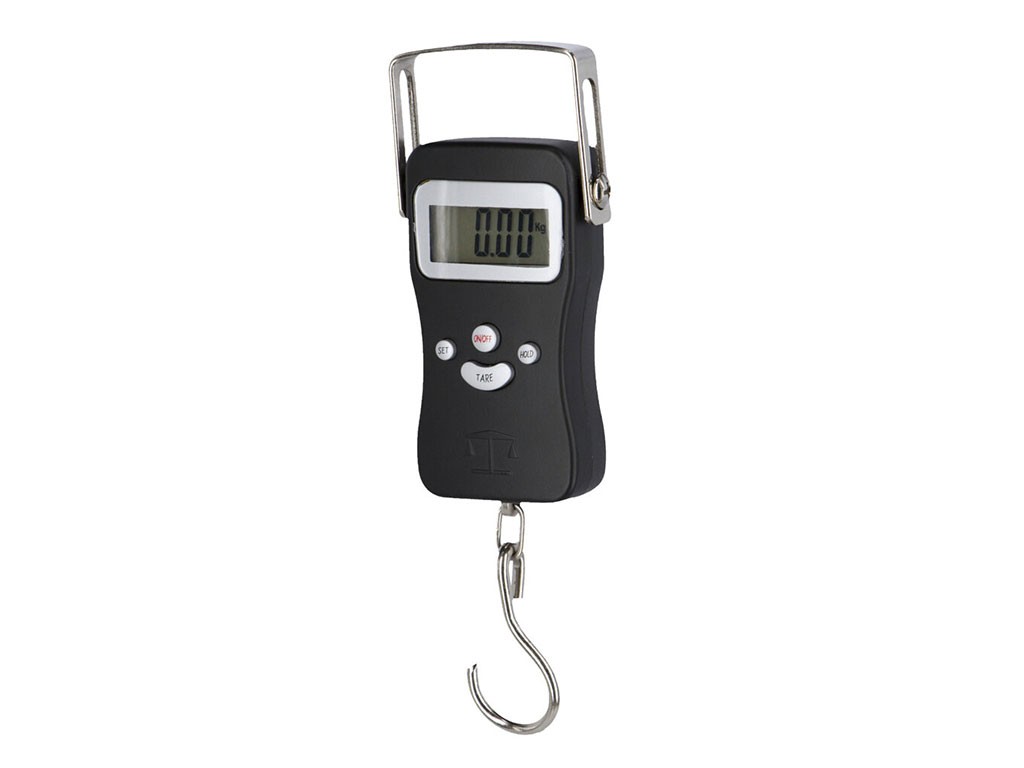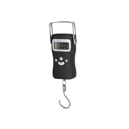 Cyfrowa waga wisząca , do 50 kilogramów, miernik zasięgu, podświetlany wyświetlacz LCD , 4-cyfrowy wyświetlacz, wyświetlacz temperatury ( °C, °F ), wskaźnik przeładowania i niskiego poziomu baterii , z funkcją HOLD , tarowaniem, automatycznym wyłączaniem.