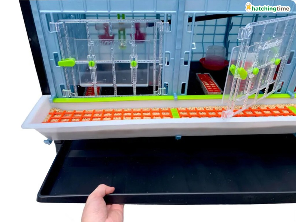 W zestawie znajdują się trzy przenośne miski na pierwsze dni życia piskląt , a kurnik jest również wyposażony w wiszący karmnik o dużej pojemności, zapewniający zapas karmy na nawet 2 dni dla każdego pisklęcia. Karmniki wykonane są z wysokiej jakości tworzywa sztucznego, odpornego na uderzenia i bardzo łatwego w utrzymaniu . Dodatkowo karmniki wyposażone są w specjalną kratkę , która zapobiega rozgrzebywaniu karmy przez pisklęta, zapobiegając tym samym jej marnowaniu . Kratka została zaprojektowana z myślą o zachowaniu odpowiedniej swobody ruchu podczas pobierania karmy.