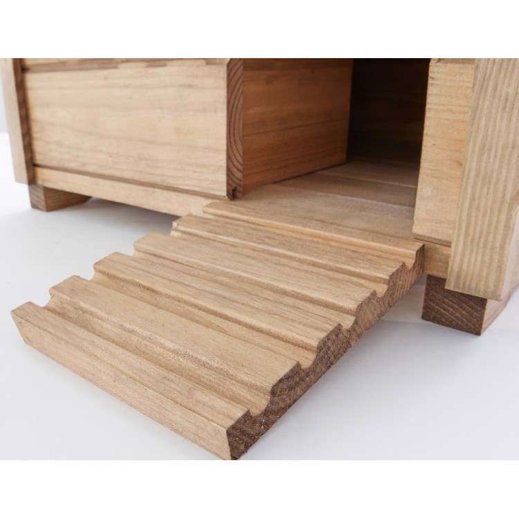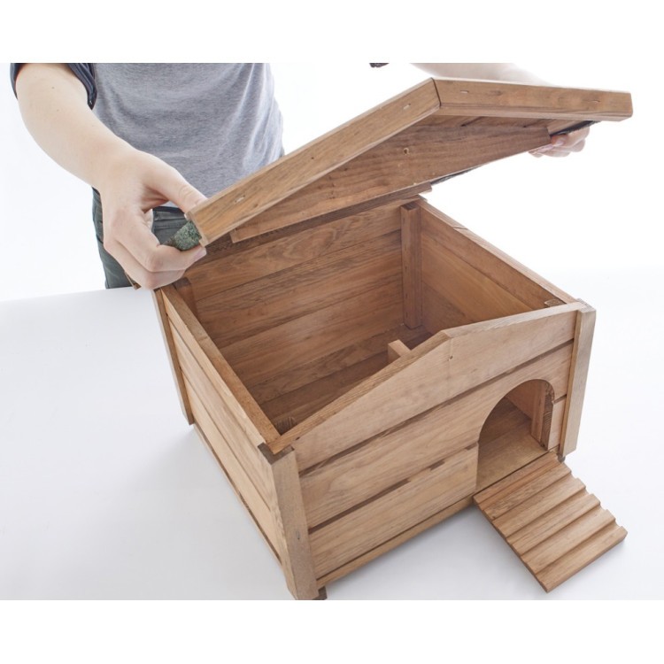 Domek wykonany jest z wysokiej jakości litego drewna, pomalowanego przyjazną dla środowiska i nietoksyczną lazurą, dzięki czemu jest odporny na warunki atmosferyczne i zniesie każdą pogodę. Spadzisty dach pokryty jest zieloną membraną bitumiczną, która chroni domek przed deszczem i śniegiem. Dodatkowo, dach można przykręcić, aby chronić jeża przed intruzami.