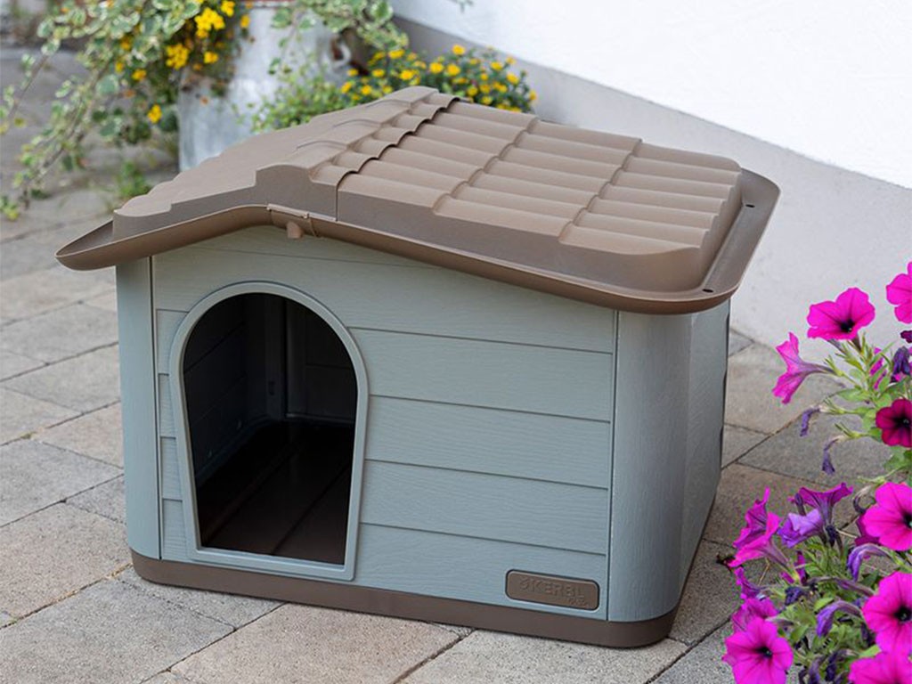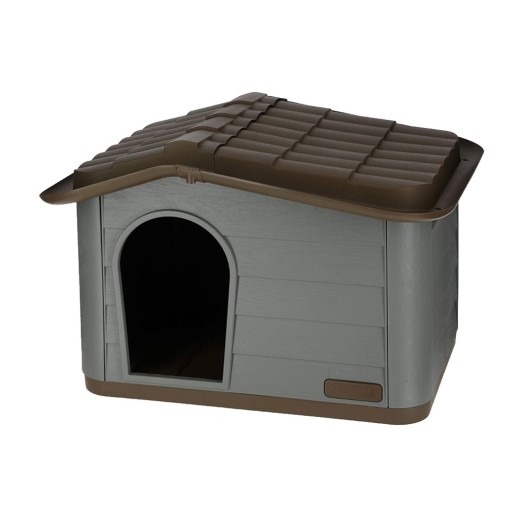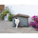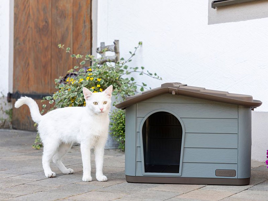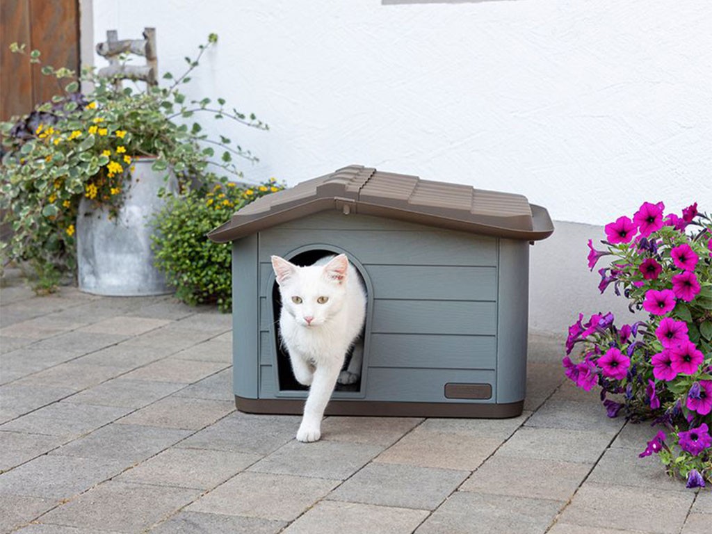 Domek dla 1-2 kotów, odpowiedni również dla małych psów, wykonany w 100% z plastiku pochodzącego z recyklingu, do użytku wewnątrz i na zewnątrz, odporny na promieniowanie UV i warunki atmosferyczne, z otworami wentylacyjnymi z boku, łatwy i szybki montaż, wymiary 60x51x41 cm.