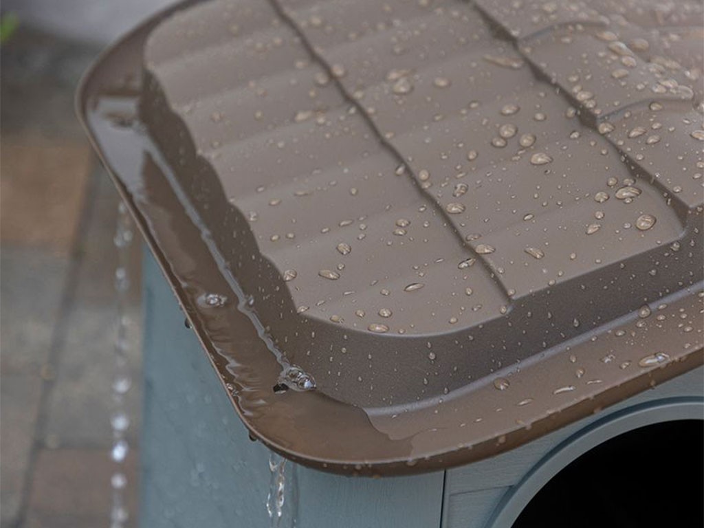 Domek dla kota wyposażony jest w mały boczny otwór wentylacyjny , zapewniający optymalną cyrkulację powietrza. Wodoodporny dach chroni kota przed deszczem i pozwala mu odpocząć w suchym pomieszczeniu .