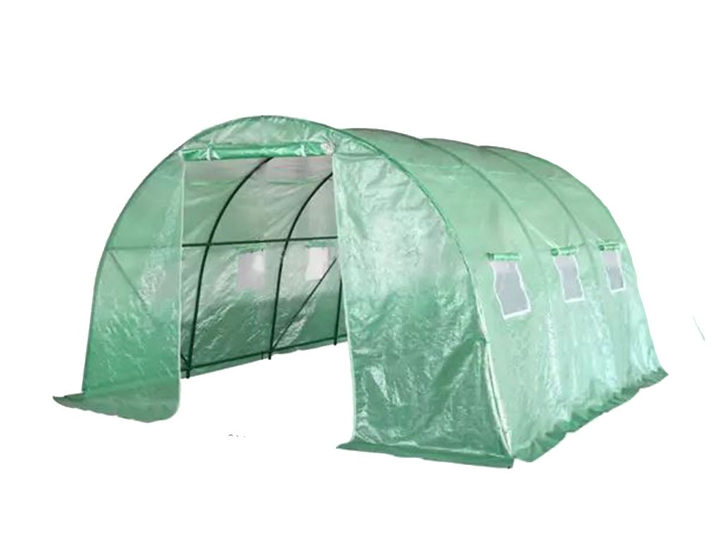 Szklarnia foliowa do uprawy roślin, zielona folia o przepuszczalności 140g/m2, włókno szklane/polietylen/metal, pręty konstrukcyjne o średnicy 25mm, 6 okien wentylacyjnych po bokach, powierzchnia szklarni foliowej 9m2, wymiary 300x300x200 cm.