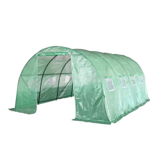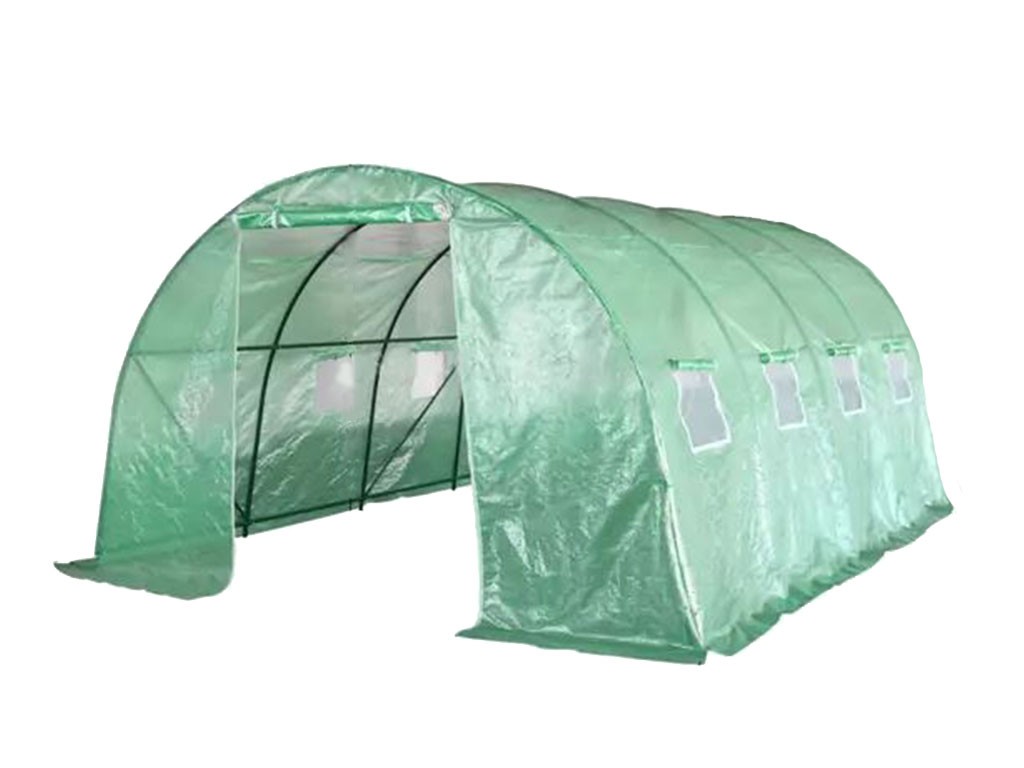Szklarnia foliowa do uprawy roślin, wykonana z zielonej folii o przepuszczalności 140g/m2, włókna szklanego/polietylenu/metalu, prętów konstrukcyjnych o średnicy 25mm, 8 okien wentylacyjnych po bokach, powierzchnia szklarni foliowej 12m2, wymiary 400x300x200 cm.