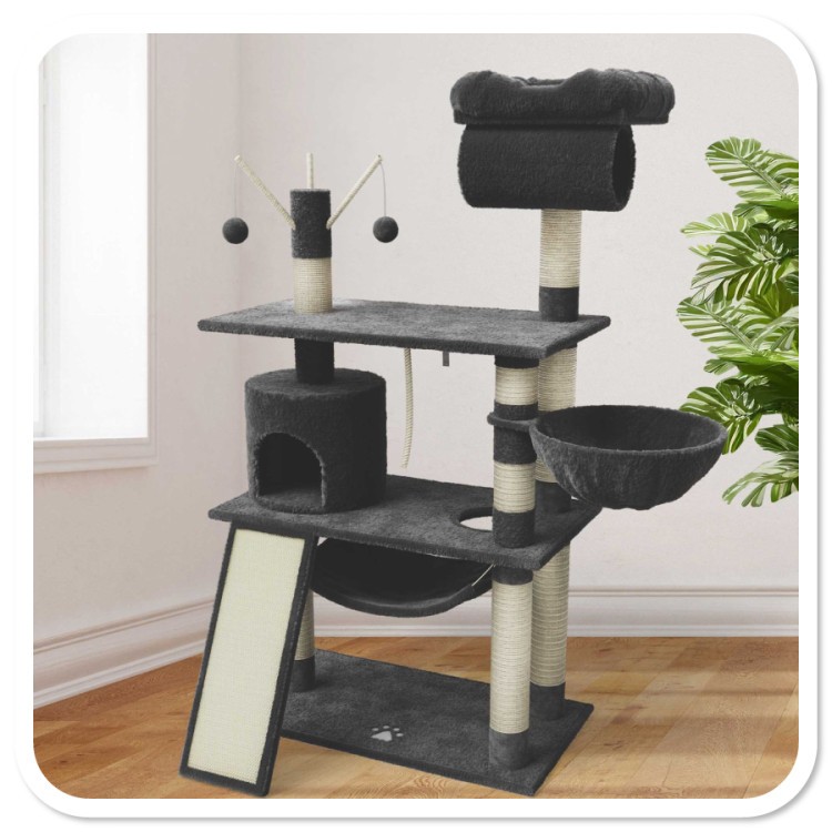 Czy Twój futrzany pupil drapie Twoją kanapę i wspina się po zasłonach? Koniec z naszym rozpieszczającym drapakiem! Podaruj swojemu kotu luksusowe schronienie . Ten wielopoziomowy drapak to idealne połączenie komfortu, bezpieczeństwa i zabawy , dzięki czemu zaspokoi wszystkie potrzeby Twojego pupila. Posiada dwa przytulne domki , trzy podwyższone platformy, pompony do zabawy, dwa hamaki i sizalowe słupki do drapania. Nowoczesny design w kolorze szarym idealnie dopełni Twoje wnętrze.