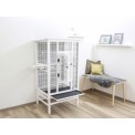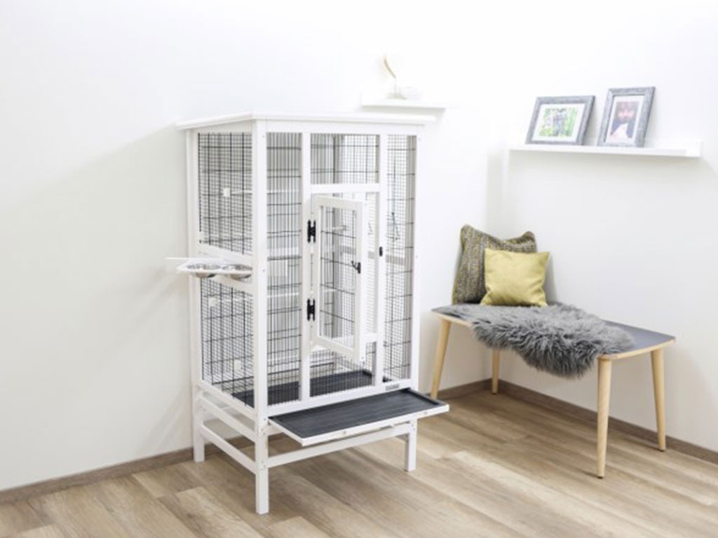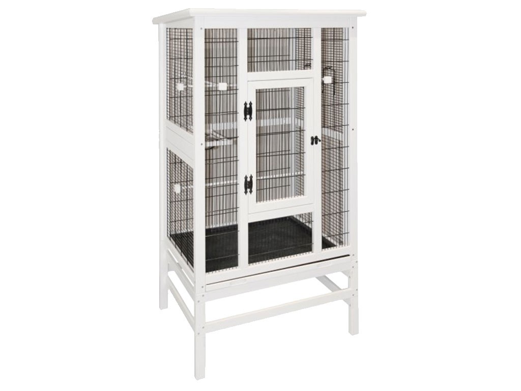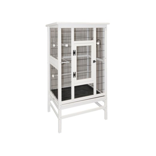 Woliera dla ptaków wykonana z litego drewna, lakierowanego drewna świerkowego, plastikowa wysuwana kuweta, okrągłe czarne pręty, dach bitumiczny, 3 zamykane drzwiczki, 4 grzędy (2 x Ø 10 mm, 2 x Ø 12 mm), obrotowa tacka z dwiema miskami, stylowy biały kolor, wymiary 82x67x151 cm.