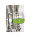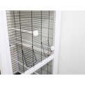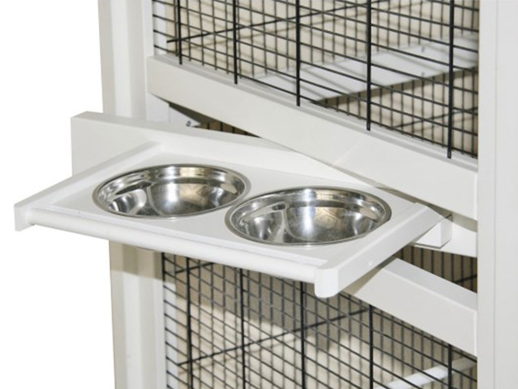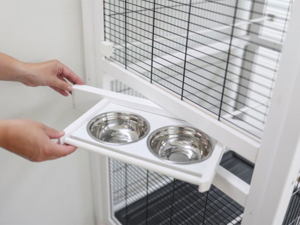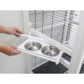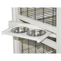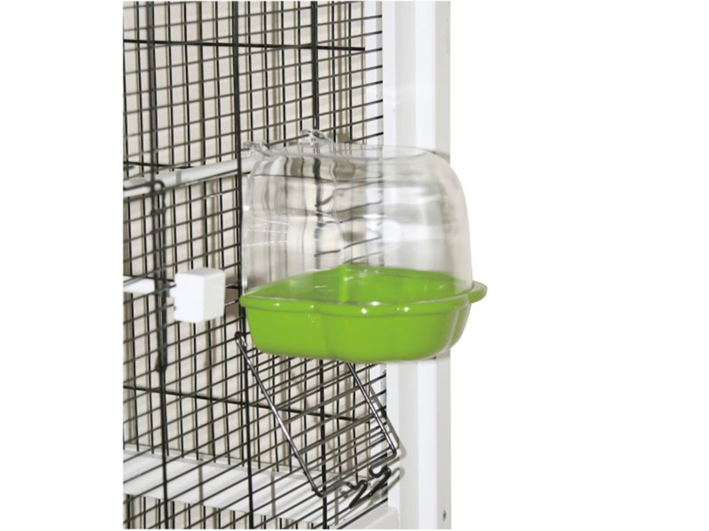 Woliera posiada wiele przydatnych funkcji , które ułatwią opiekę nad ptakami. Z boku woliery znajduje się obrotowa tacka z dwiema miskami ze stali nierdzewnej, do których można łatwo dodać karmę i wodę bez konieczności otwierania drzwiczek klatki . Dodatkowo, na tacy znajduje się praktyczna grzęda, która ułatwia ptakom dostęp do misek. Woliera zawiera również 4 duże grzędy (2 x Ø 10 mm, 2 x Ø 12 mm), które zapewnią ptakom wystarczająco dużo miejsca do odpoczynku, a także do zabawy. Z boku klatki znajdują się dwoje mniejszych drzwiczek, do których można w razie potrzeby przymocować dodatkowe karmniki (niedołączone do zestawu).