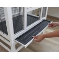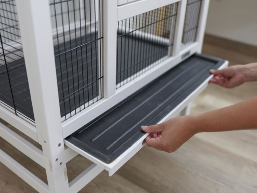 Klatka zapewnia również wygodę w utrzymaniu czystości, co jest łatwe i szybkie dzięki chowanej kuwecie. Kuweta ma plastikowe dno , które jest łatwe w czyszczeniu i nie wchłania zapachów ani płynów. Wystarczy je wyciągnąć, wyczyścić i wsunąć z powrotem. Dla jeszcze łatwiejszego czyszczenia, na kuwecie można umieścić gazety (niedołączone do zestawu). Aby Twoja woliera służyła jeszcze dłużej, zalecamy umieszczenie jej pod zadaszeniem i regularną wymianę powłoki ochronnej drewna .