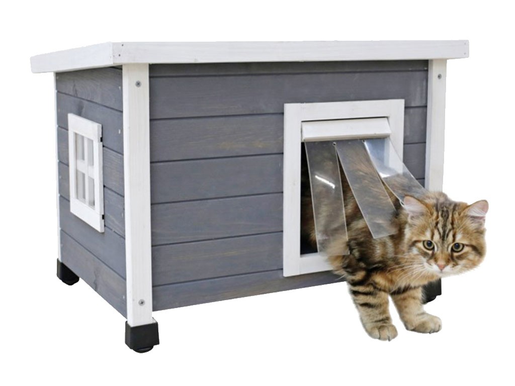 Drewniany domek dla kota o wymiarach 57 x 45 x 43 cm w kolorze szarym . To idealny domek dla kota z nóżkami o regulowanej wysokości i z drzwiami na zawiasach , które chronią Twojego pupila przed wiatrem i zimnem .