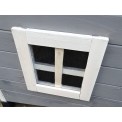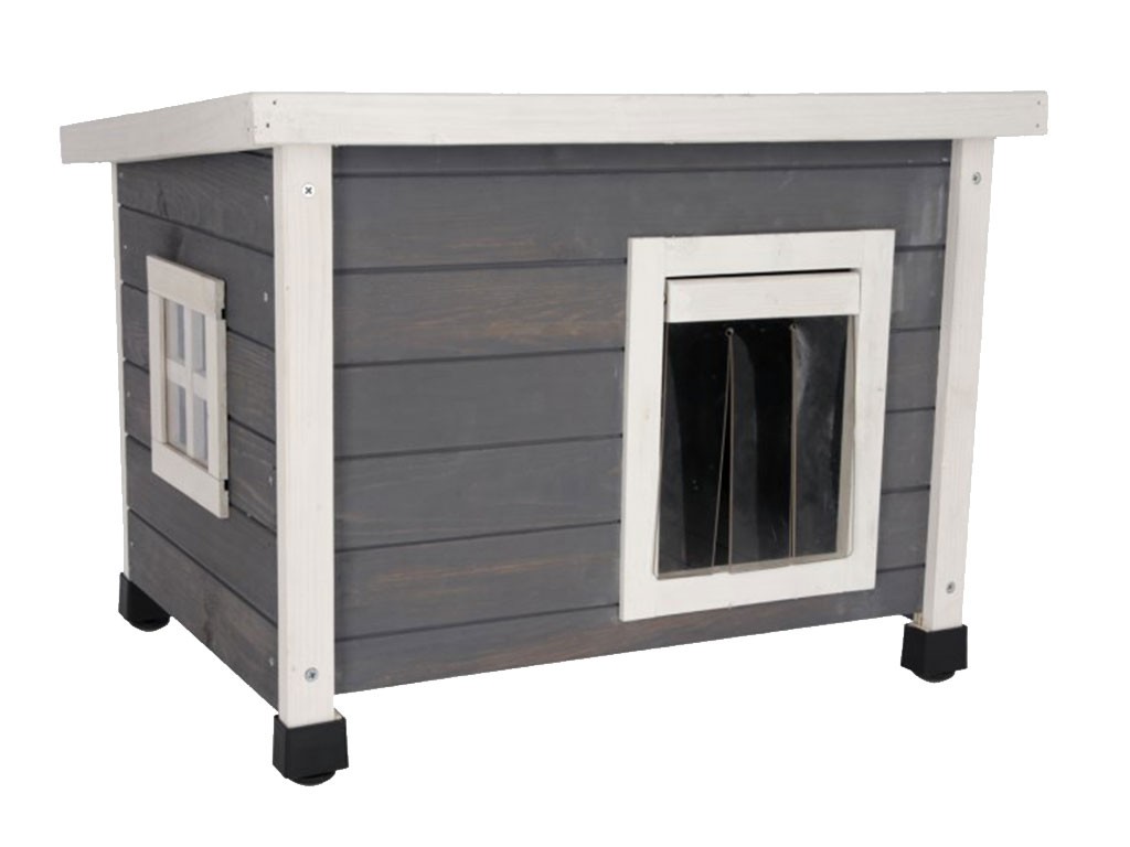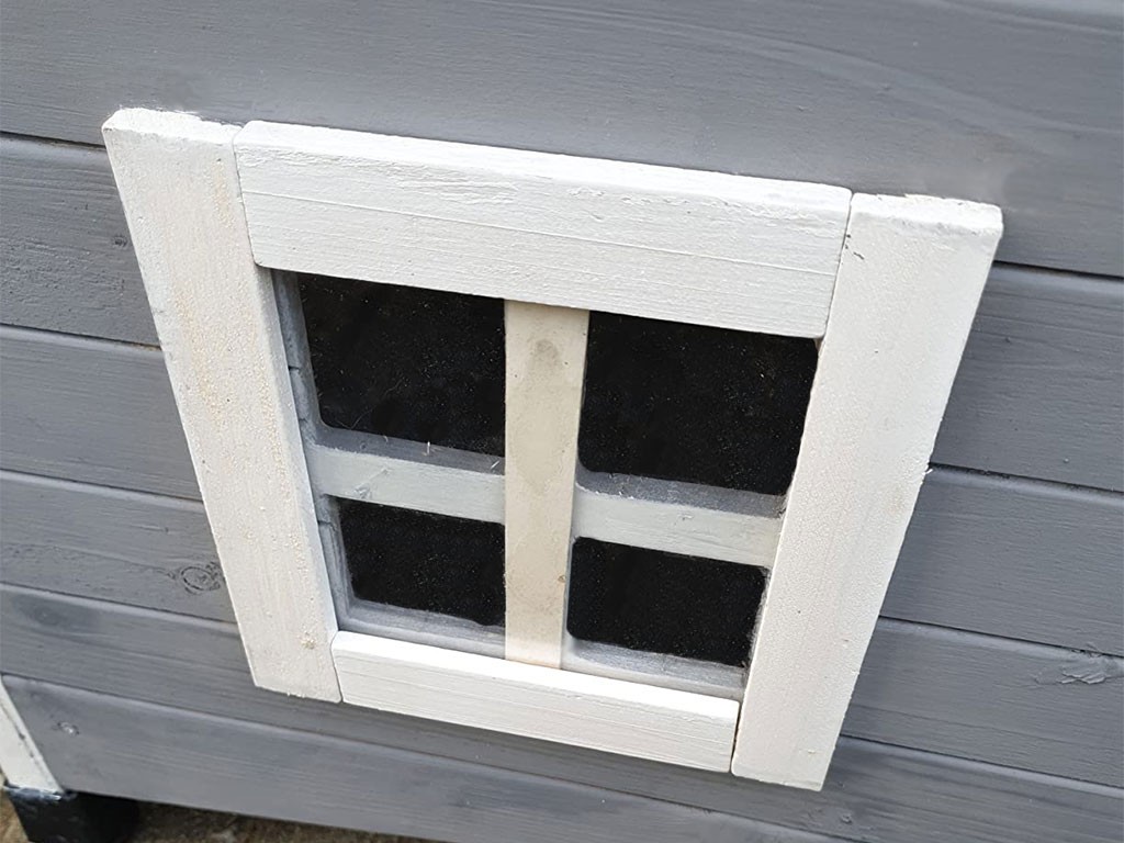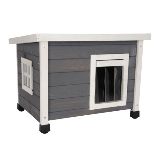 Domek dla kota wyposażony jest w małe okienko wypełnione pleksiglasem, które zapewnia więcej światła w środku . Drzwi wyposażone są w zawiasowe, przezroczyste listwy , które chronią kota wewnątrz domku przed wiatrem i zimnem . Domek posiada cztery plastikowe nóżki z regulacją wysokości.