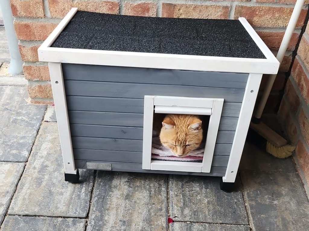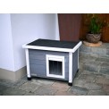 Drewniany domek dla kota waży około 7 kg. Dach domku pokryty jest wodoodpornym materiałem ochronnym. Zalecamy jednak umieszczenie domku pod daszkiem , aby chronić go przed deszczem, śniegiem i intensywnym nasłonecznieniem. Powierzchnia drewnianego domku jest zabezpieczona podstawową powłoką ochronną. Aby przedłużyć jego żywotność, powłokę ochronną należy odnawiać, tak jak w przypadku każdego drewna.