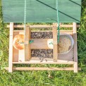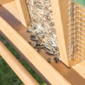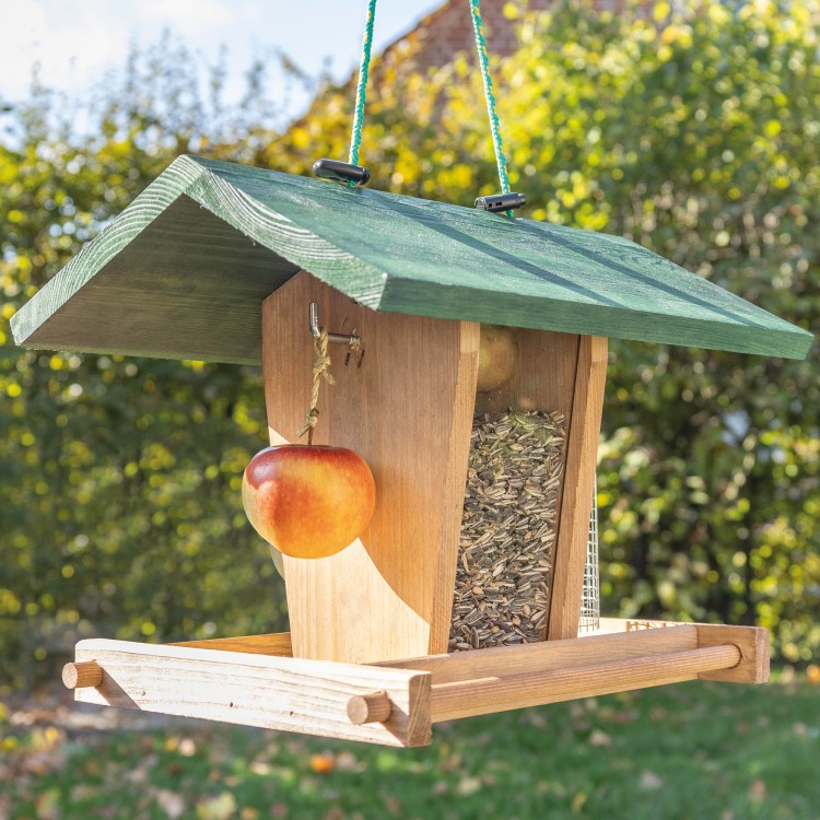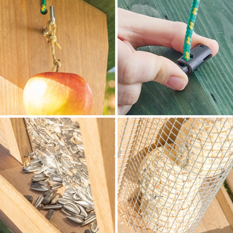 Karmnik można szybko i łatwo napełnić dużą ilością karmy – dzięki czemu nie trzeba go ciągle uzupełniać. Uzupełnianie jest proste – wystarczy zdjąć dach karmnika i wsypać nowe smakołyki, takie jak kulki tłuszczowe, orzechy i ściółkę. Dzięki wytrzymałemu pleksiglasowi widać, kiedy karmnik wymaga uzupełnienia. Karma jest więc idealnie chroniona przed wilgocią. Małe ptaki, takie jak wróble, rudziki i inne, mogą usiąść na dwóch bocznych grzędach i wygodnie dziobać ziarno z silosu.