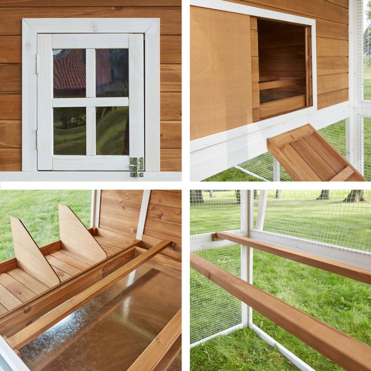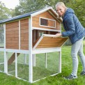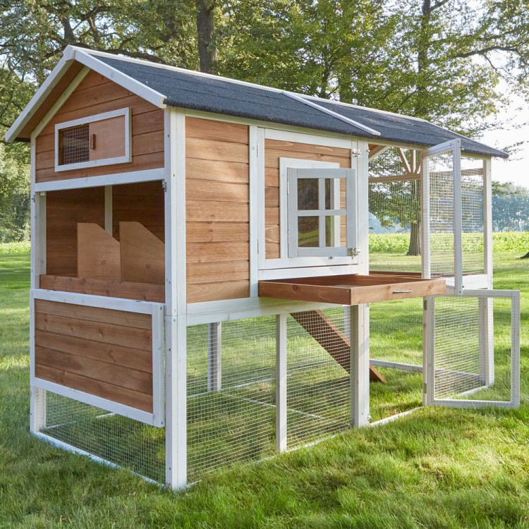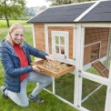 Trwała konstrukcja z litego drewna zapewnia kurom wysoki komfort w kurniku. Kurnik jest bardzo przestronny. Wybieg jest oddzielony od wnętrza przesuwanymi drzwiami z uchwytem, które można otwierać z zewnątrz, bez konieczności otwierania kurnika. Montaż jest prosty dzięki ilustrowanej instrukcji i może go wykonać każdy.