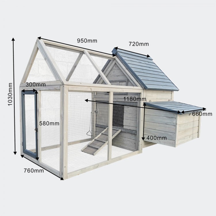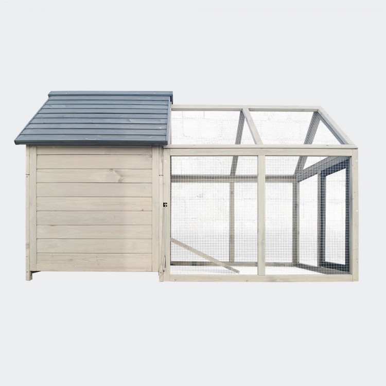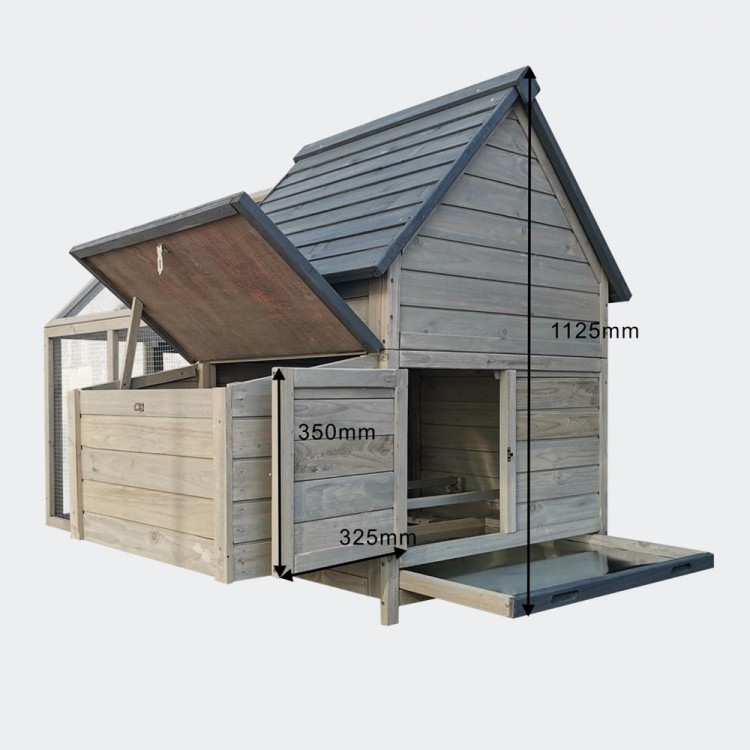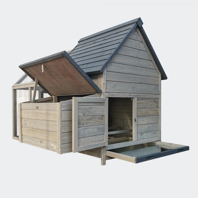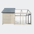 Kurnik jest bardzo przestronny, a wybieg można łatwo oddzielić od wnętrza za pomocą przesuwanych drzwi z uchwytami, otwieranych od zewnątrz.