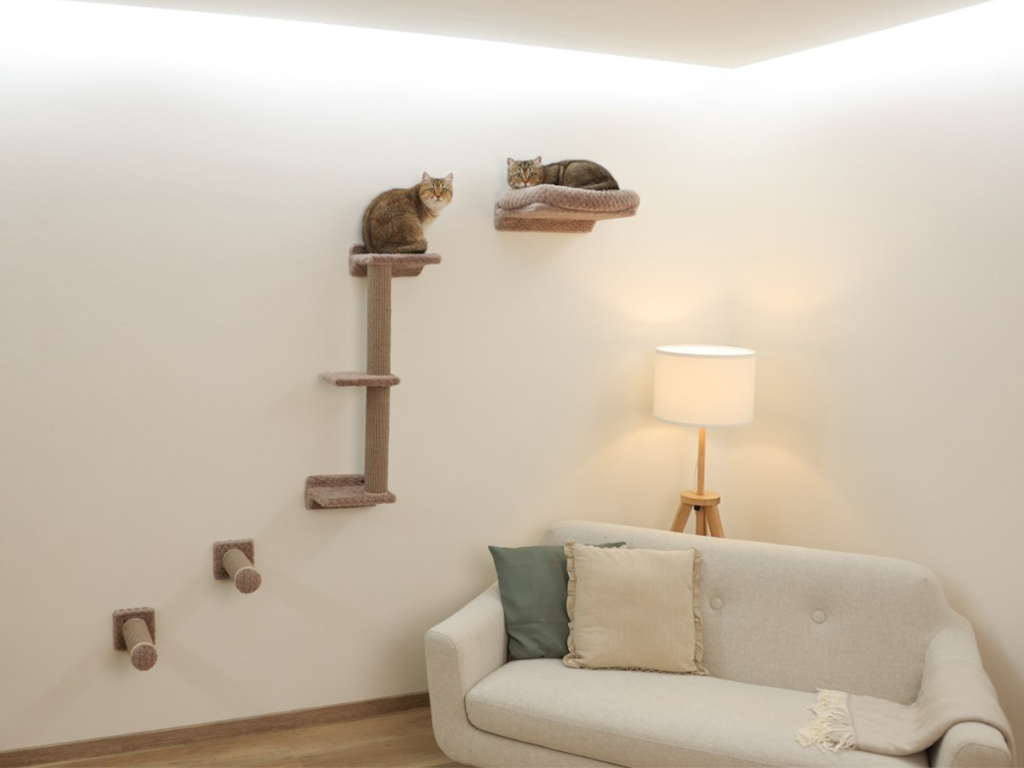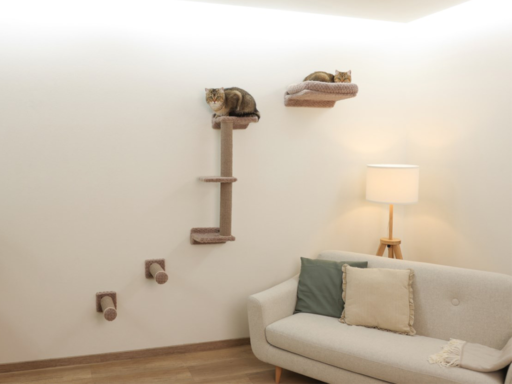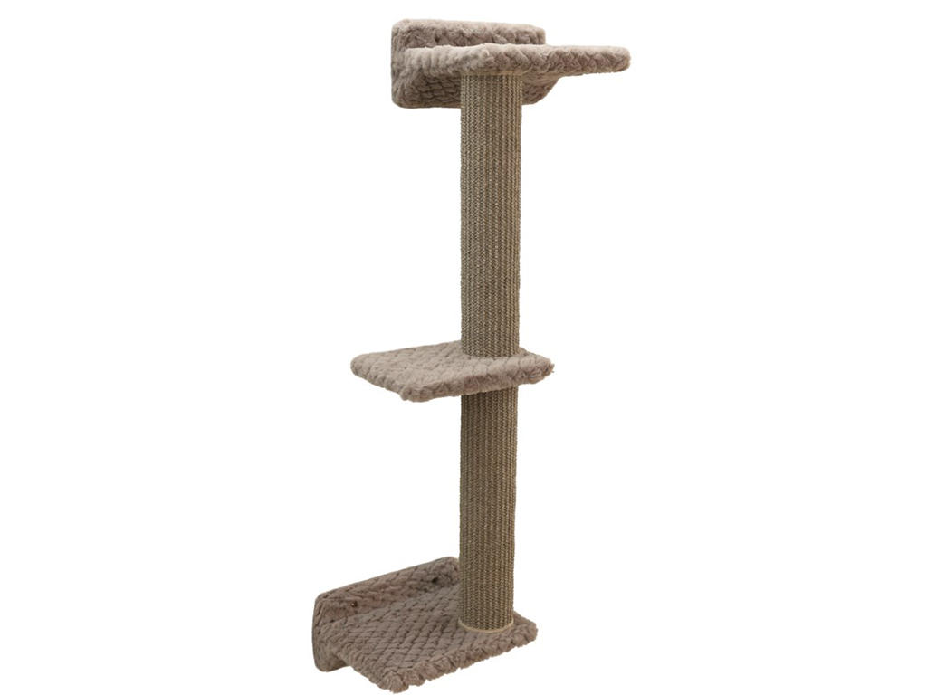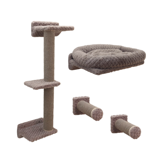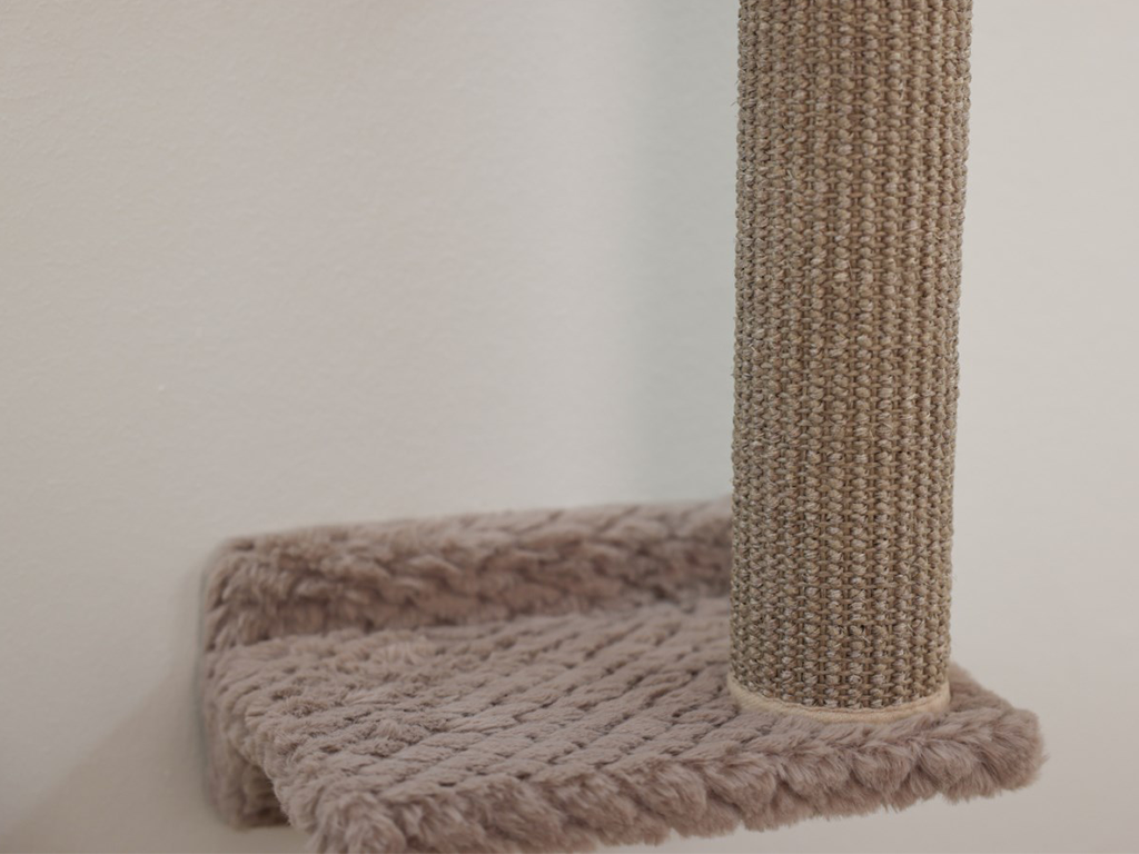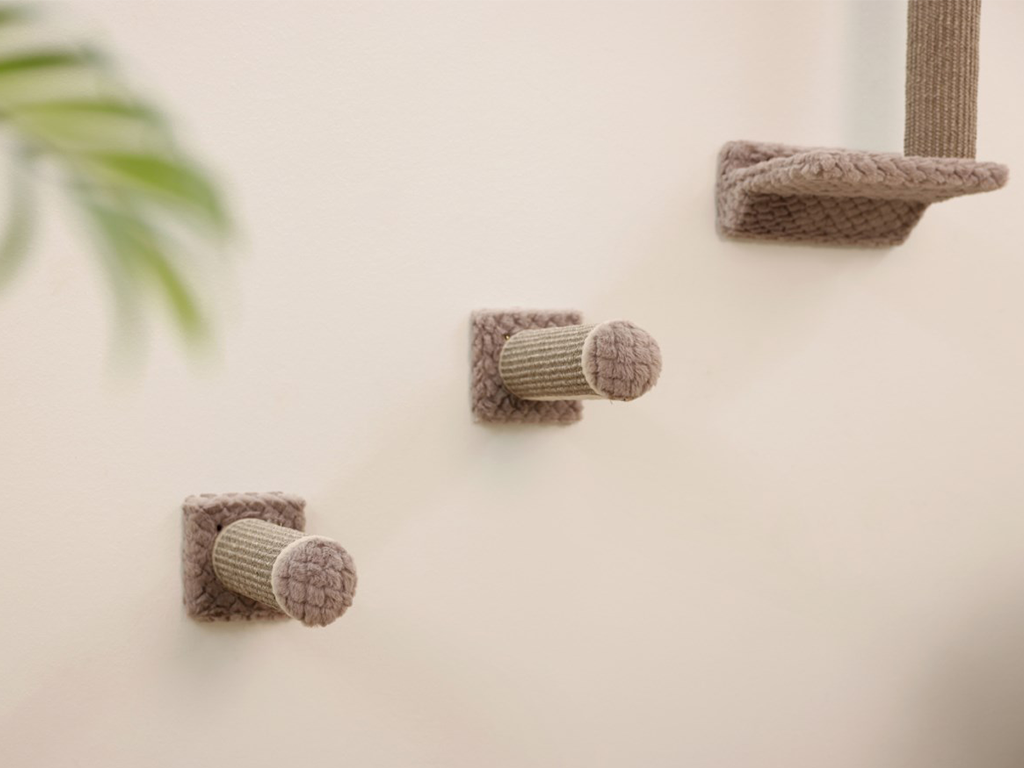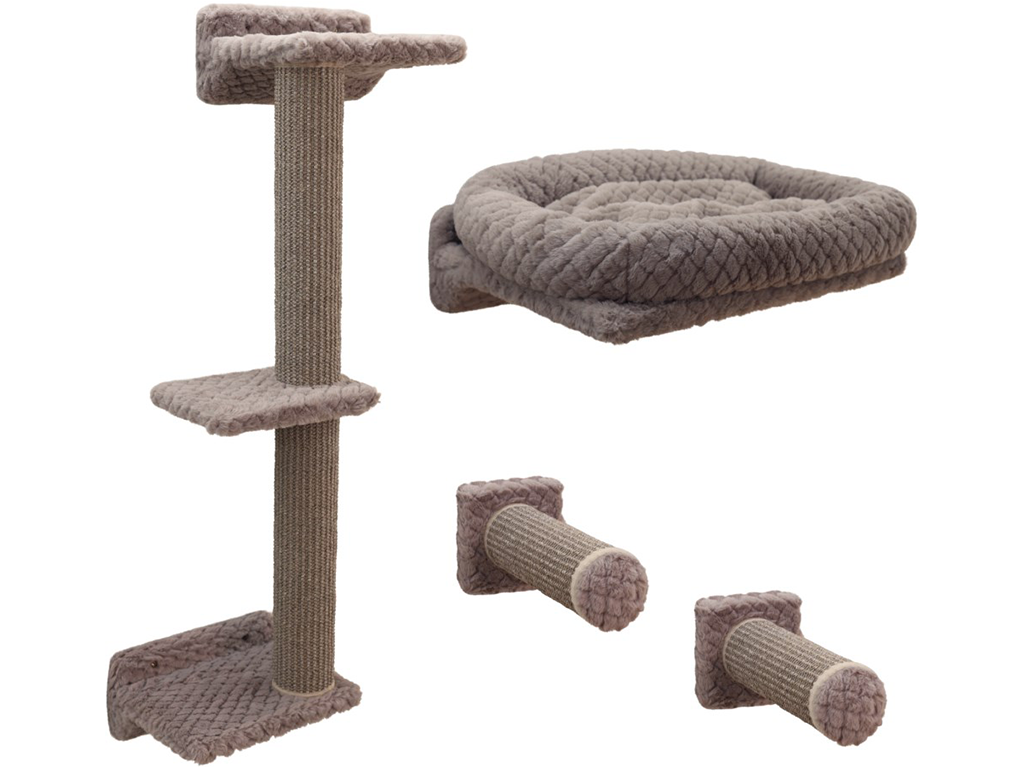 Drapak dla kota na ścianę składa się z ośmiu części , które można zamontować na ścianie, dostosowując je do indywidualnych potrzeb. Elementy do zakotwiczenia w ścianie znajdują się w zestawie. Wieża wspinaczkowa składa się z dwóch słupków o średnicy 8,5 cm i długości 40 cm, dwóch stopni o wymiarach 26 x 19 cm oraz jednego stopnia o wymiarach 23 x 15,5 cm. W zestawie znajdują się również dwa słupki do ostrzenia pazurów o średnicy 8,5 cm i długości 26 cm , wyściełane sizalem. Dla zapewnienia idealnego komfortu i wygody Twojego pupila, w zestawie znajduje się również przytulne legowisko o wymiarach 45 x 35 cm. Elementy pokryte są miękkim pluszem.