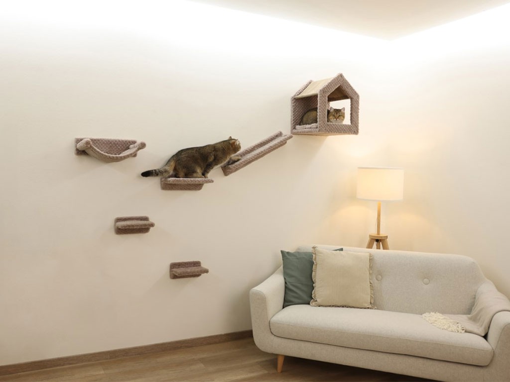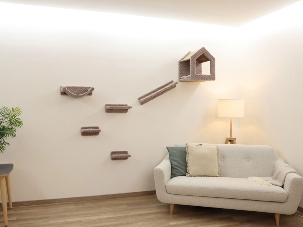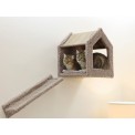 Drapak dla kota montowany na ścianie , zestaw sześciu części , montaż na ścianie zgodnie z indywidualnymi możliwościami przestrzeni , przytulny domek, dwa podnóżki, deska tarasowa, rampa i hamak, nośność 10 kg .
