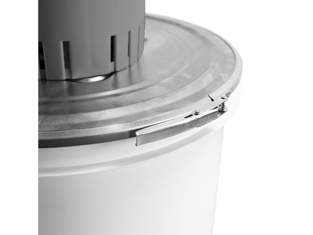Po rozdrobnieniu surowca na wybranym sicie do wymaganej grubości , trafia on do beczki magazynowej o pojemności 50 l . Po zakończeniu rozdrabniania beczkę można zamknąć pokrywą z blokadą bezpieczeństwa i przechowywać w niej surowiec tak długo, jak to konieczne.