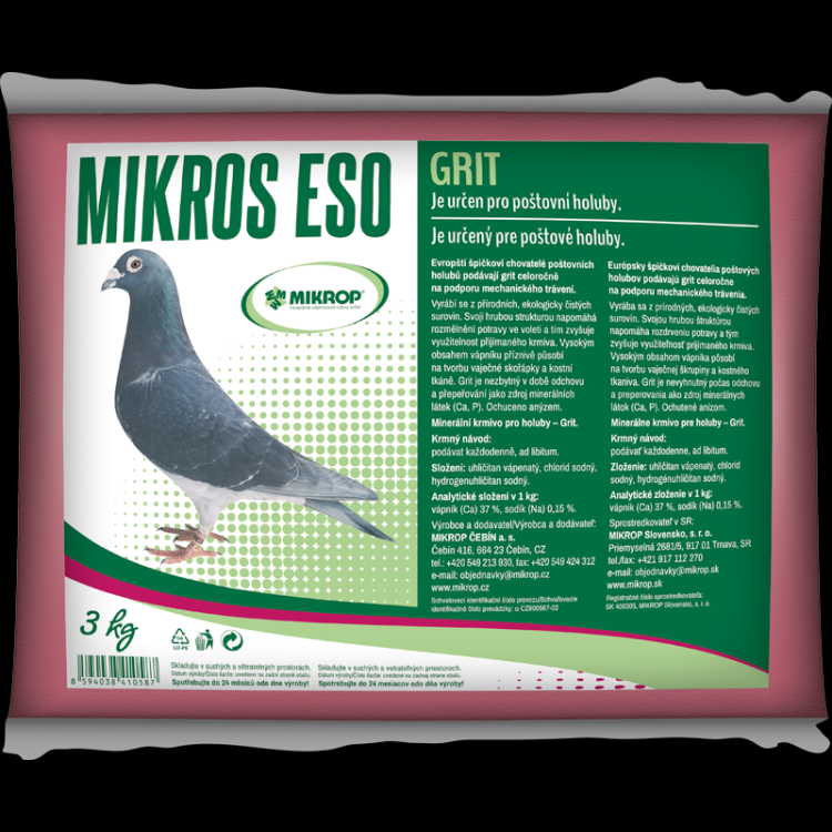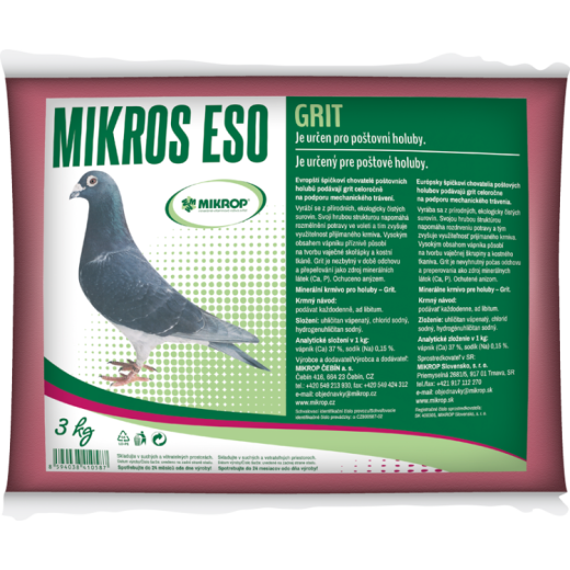 Grit o podwyższonej zawartości żelaza dla gołębi pocztowych wspomaga trawienie i zwiększa natlenienie krwi w organizmie gołębia pocztowego, pomagając w ten sposób efektywniej przekazywać energię do mięśni podczas lotu lub wzmożonego wysiłku. Jest wytwarzany z naturalnych, ekologicznych surowców, a jego gruba struktura ułatwia rozdrabnianie pokarmu, zwiększając tym samym jego użyteczność. Wysoka zawartość wapnia korzystnie wpływa na budowę skorup jaj i tkanki kostnej. Niezbędny w okresie lęgowym i pierzenia – jako źródło minerałów (Ca, P).