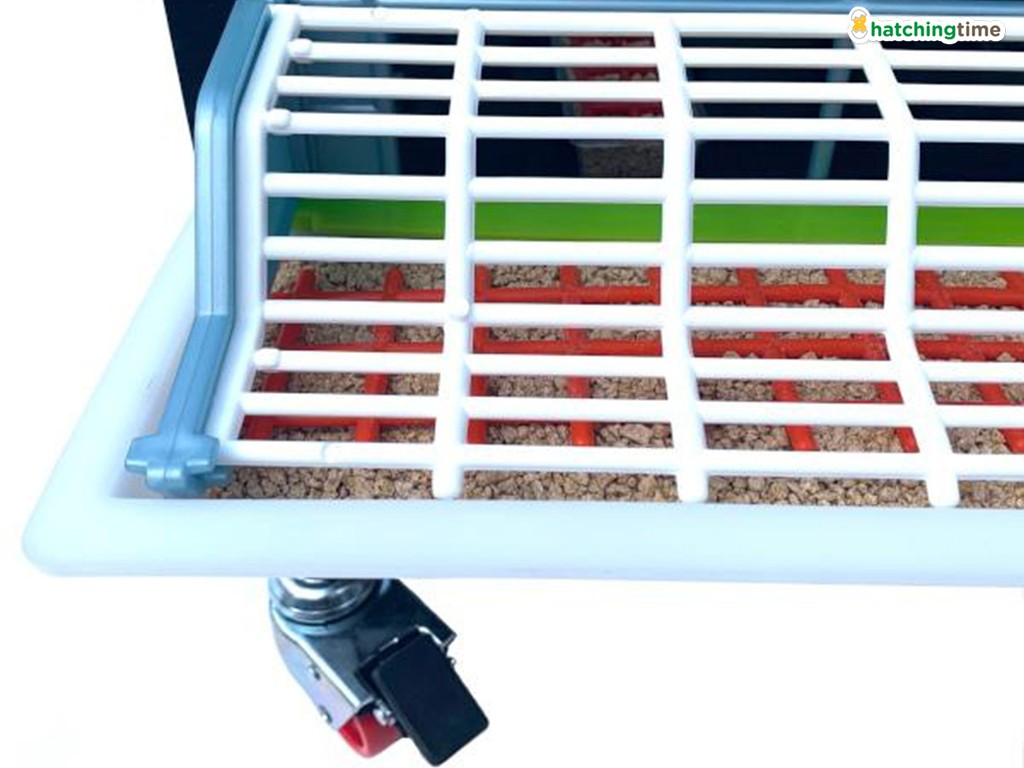 Wymiary złożonej dwupiętrowej hodowli, wliczając koła, zbiornik na wodę, elementy grzewcze i karmniki, wynoszą 104 x 60 x 91 cm.