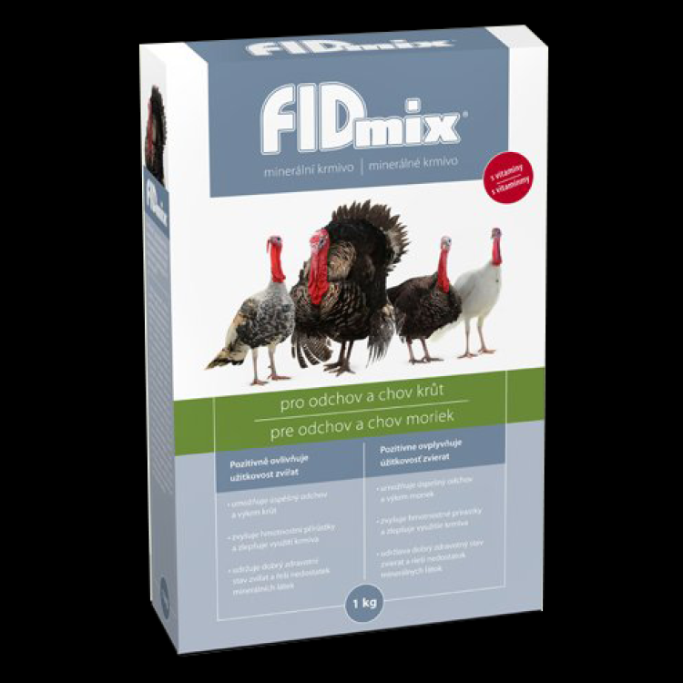 FIDmix to pasza mineralno-witaminowa opracowana specjalnie dla indyków w odchowie i tuczu. Jej skład zawiera substancje biologicznie czynne, takie jak witaminy, minerały, lizynę, metioninę i sól paszową, które pozwalają na uzupełnienie niepełnowartościowej dawki pokarmowej do wymaganego poziomu. Dzięki temu zoptymalizowana pasza zapewni dobrą zdrowotność i żywotność indyków, poprawi przyrosty masy ciała i efektywność wykorzystania paszy.