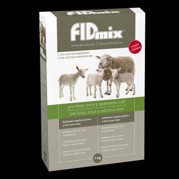 FIDmix to pasza mineralno-witaminowa opracowana specjalnie dla kóz, owiec i zwierząt kopytnych. Jej skład zawiera minerały (makro- i mikroelementy) oraz witaminy niezbędne dla zapewnienia zbilansowanej diety i optymalnego zdrowia tych zwierząt. FIDmix został opracowany, aby pomóc w uzupełnianiu niedoborów minerałów i witamin, które mogą występować w dawkach pokarmowych małych przeżuwaczy, takich jak owce, kozy i zwierzęta kopytne.