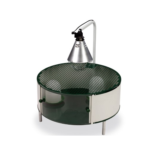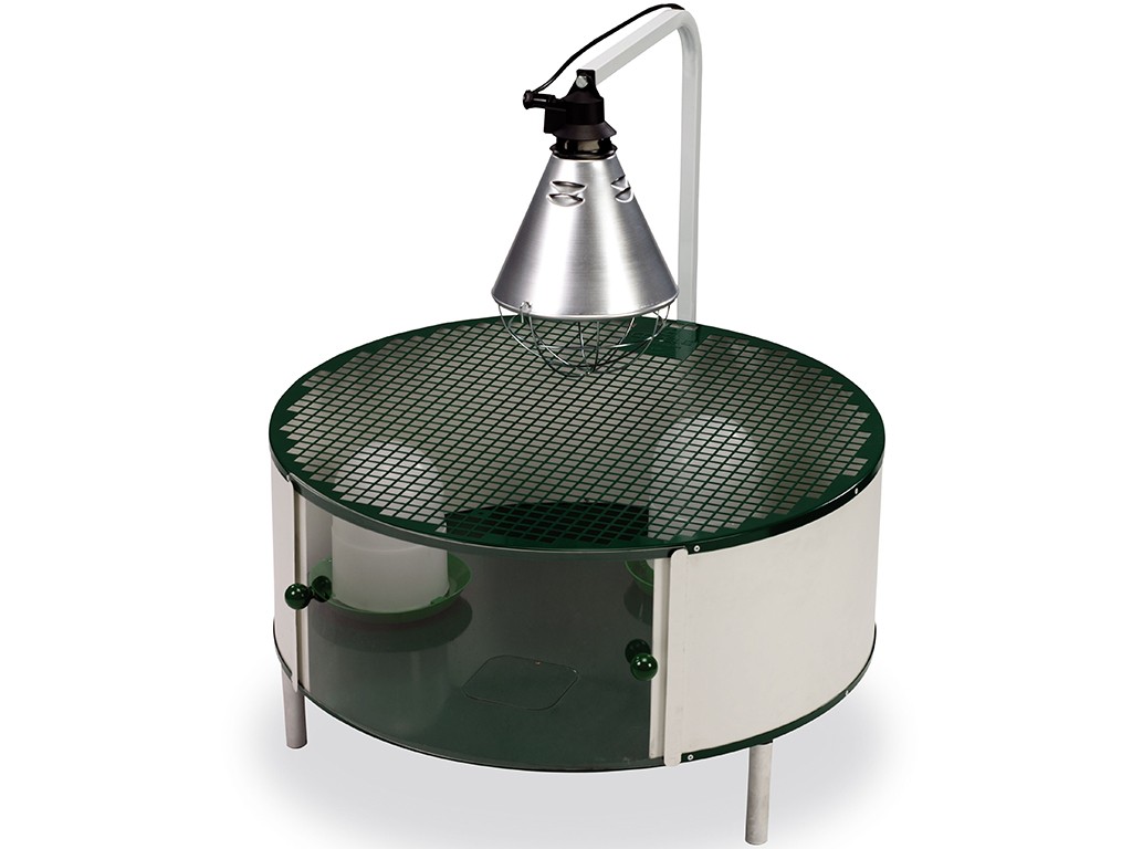 Kurnik hodowlany dla drobiu, odpowiedni do hodowli od 25 do 30 kurcząt, o wymiarach Ø 71 x 79 cm . Jest to kompletny, okrągły kurnik hodowlany, wyposażony w aluminiową lampę z żarówką podczerwieni, poidło o pojemności 2 litrów i podajnik o pojemności 2 kg.