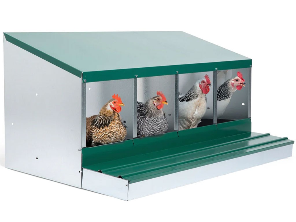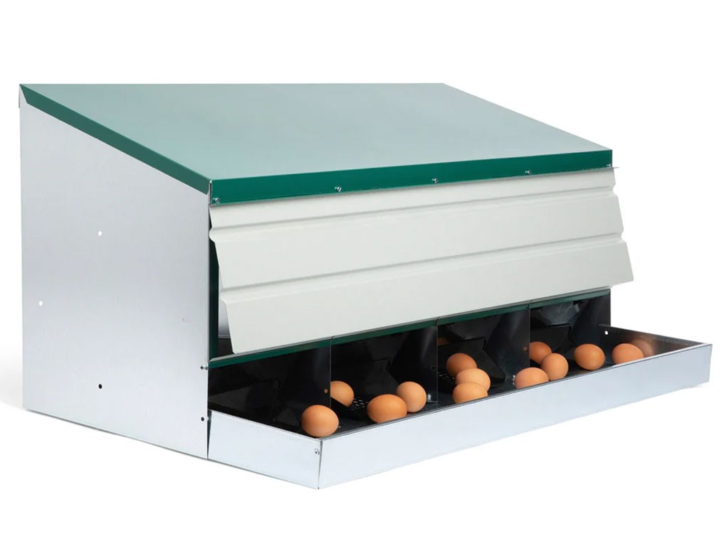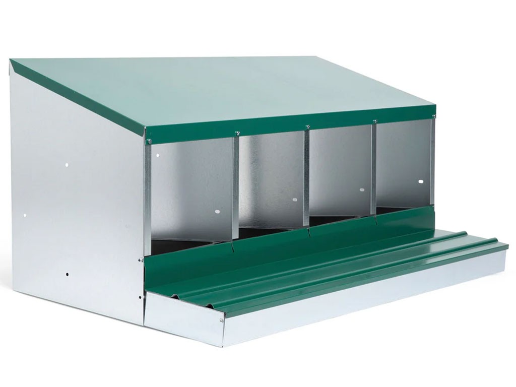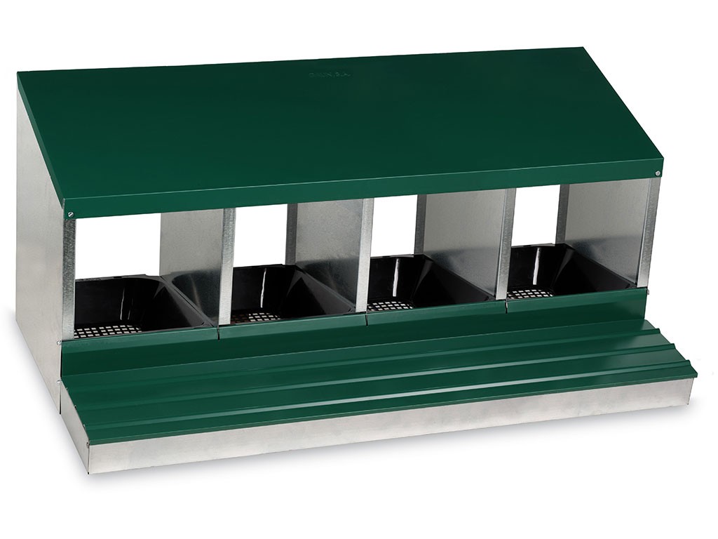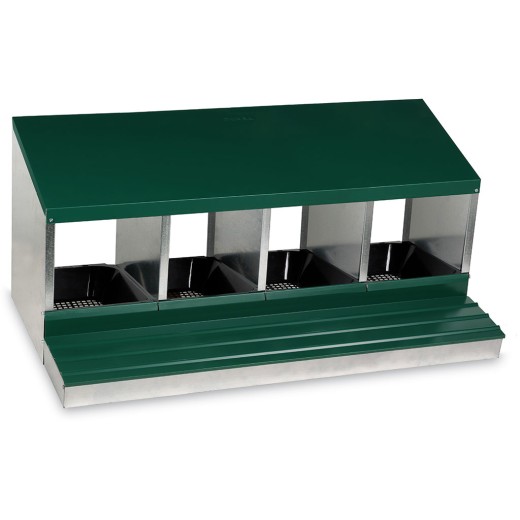 Gniazdo dla kur niosek z koszem do zbierania jaj, czterostanowiskowe , pojemność do 20 kur niosek (5 kur niosek na wylęgarnię). Dno gniazda jest pochyłe, jaja same zwijają się do kosza. Wykonane z ocynkowanej blachy, w kolorze zielonym . Gniazdo można po prostu postawić na ziemi w kurniku lub zawiesić na ścianie . Bardzo łatwe w utrzymaniu czystości. Wymiary: Długość 56 cm x szerokość 106,3 cm x wysokość 45,5 cm.