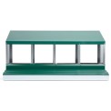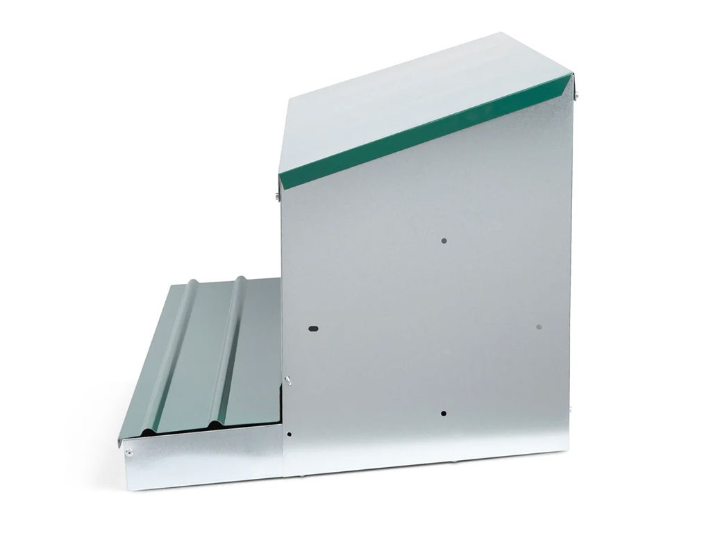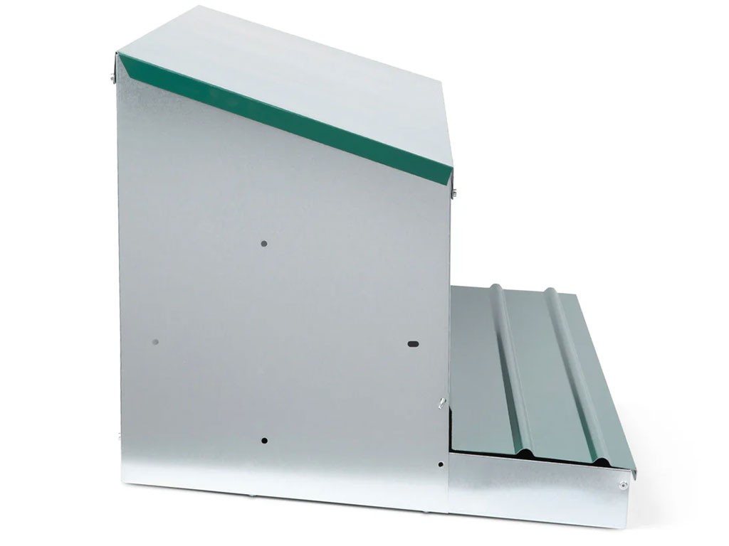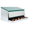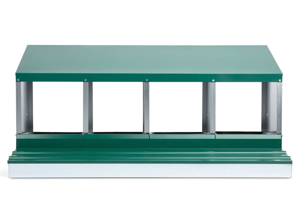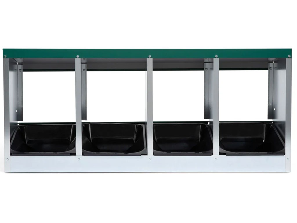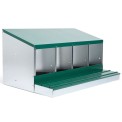Gniazdo dla kur niosek z koszem do zbierania jaj, czterostanowiskowe , pojemność do 20 kur niosek (5 kur niosek na wylęgarnię). Dno gniazda jest pochyłe, jaja same zwijają się do kosza. Wykonane z ocynkowanej blachy, w kolorze zielonym . Gniazdo można po prostu postawić na ziemi w kurniku lub zawiesić na ścianie . Bardzo łatwe w utrzymaniu czystości. Wymiary: Długość 56 cm x szerokość 106,3 cm x wysokość 45,5 cm.