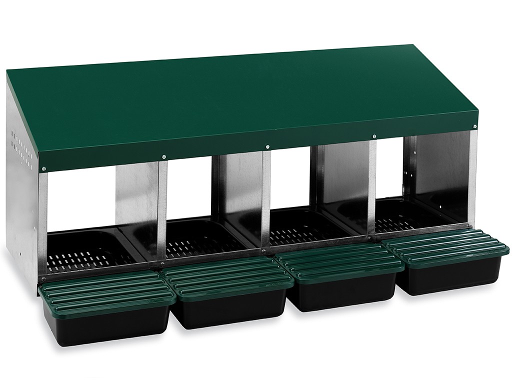 Gniazdo do niosek dla kur z koszem do zbierania jaj, czterostanowiskowe , pojemność do 20 kur niosek (5 kur niosek na wylęgarnię). Dno gniazda jest pochyłe, jaja same zwijają się do kosza . Wykonane z ocynkowanej blachy z plastikowym dnem, w kolorze zielonym . Gniazdo można po prostu postawić na ziemi w kurniku lub zawiesić na ścianie . Bardzo łatwe w utrzymaniu czystości. Wymiary: Długość 48 cm, szerokość 106,1 cm, wysokość 52 cm.
