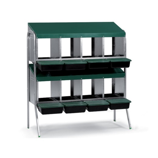 Gniazdo dla kur z koszem do zbierania jaj, 8-miejscowe na nóżkach, pojemność do 40 kur niosek (5 kur niosek w kurniku). Dno gniazda jest pochyłe, jaja same zwijają się do kosza . Wykonane z ocynkowanej blachy z plastikowym dnem, w kolorze zielonym . Gniazdo można po prostu postawić na ziemi w kurniku . Bardzo łatwe w utrzymaniu czystości. Wymiary: Długość 52,5 cm x szerokość 109,1 cm x wysokość 121 cm.