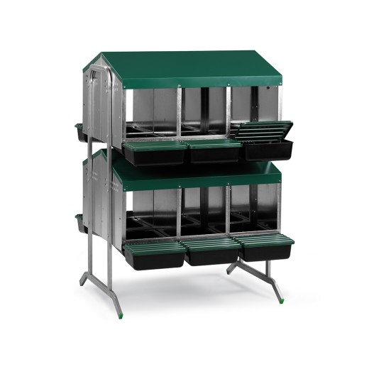 Gniazdo dla kur z koszem do zbierania jaj, 12 miejsc na nóżkach, pojemność do 60 kur niosek (5 kur niosek w kurniku). Dno gniazda jest pochyłe, jaja same zwijają się do kosza . Wykonane z ocynkowanej blachy z plastikowym dnem, w kolorze zielonym . Gniazdo można po prostu umieścić na ziemi w kurniku . Bardzo łatwe w utrzymaniu czystości. Wymiary: Długość 105,5 cm x szerokość 82,7 cm x wysokość 121 cm.