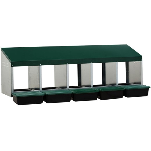 Gniazdo dla kur niosek z koszem do zbierania jaj, pięciostanowiskowe , pojemność do 25 kur niosek (po 5 kur niosek w kurniku). Dno gniazda jest pochyłe, jaja same zwijają się do kosza . Wykonane z ocynkowanej blachy z plastikowym dnem, w kolorze zielonym . Gniazdo można po prostu postawić na ziemi w kurniku lub zawiesić na ścianie . Bardzo łatwe w utrzymaniu czystości. Wymiary: Długość 132,5 cm, szerokość 49,5 cm, wysokość 49 cm.