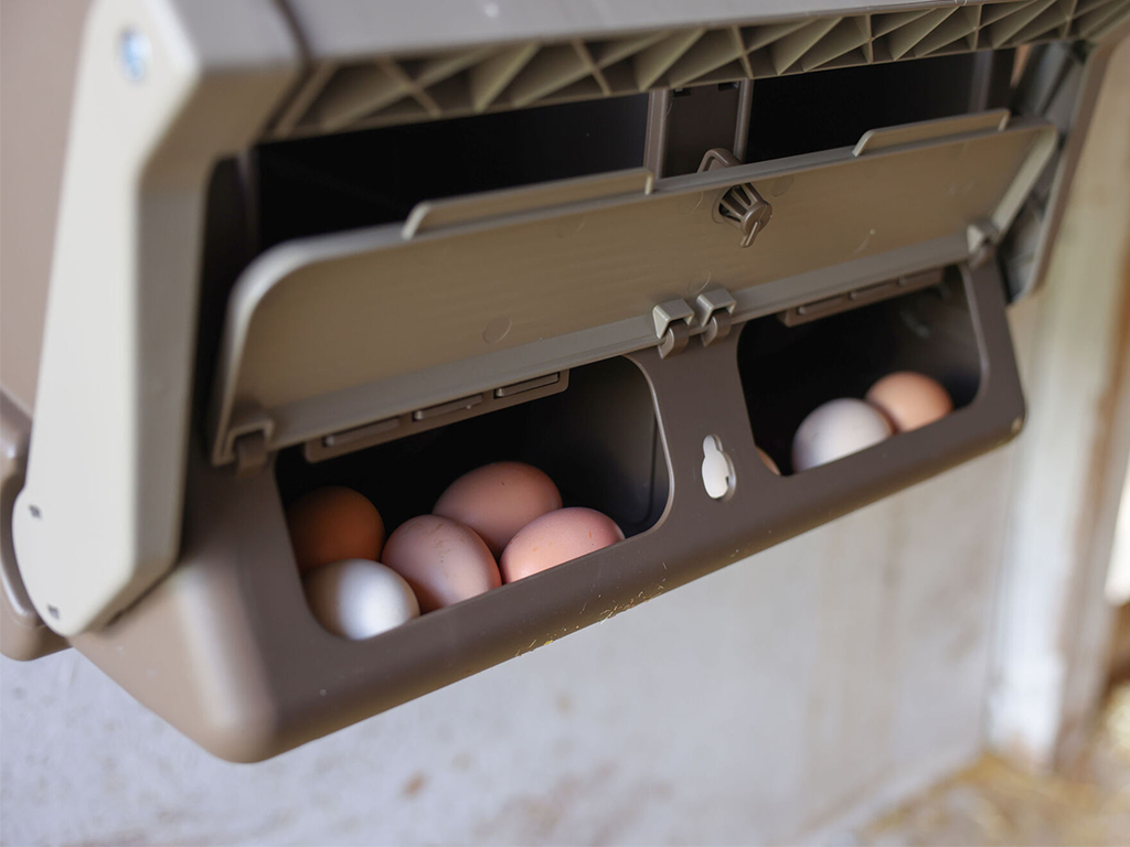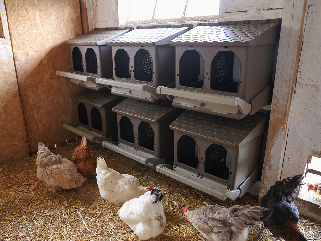 Gniazdo dla kur niosek z tacką do zbierania jaj , pojemność do 10 kur niosek (5 kur niosek na wylęgarnię). Dno gniazda jest pochyłe, jaja same zsuwają się do tacki o pojemności do 20 jaj , wykonanej z tworzywa sztucznego. Nadaje się do montażu na ścianie, bardzo łatwe w utrzymaniu , wymiary: 52 cm długości x 59 cm szerokości x 53 cm wysokości.