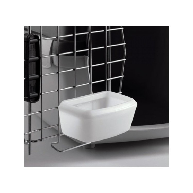Klatka dla psa z uchwytem i miską - GULLIVER. Plastikowa klatka z metalowymi, zamykanymi drzwiczkami. Kółka można kupić osobno.