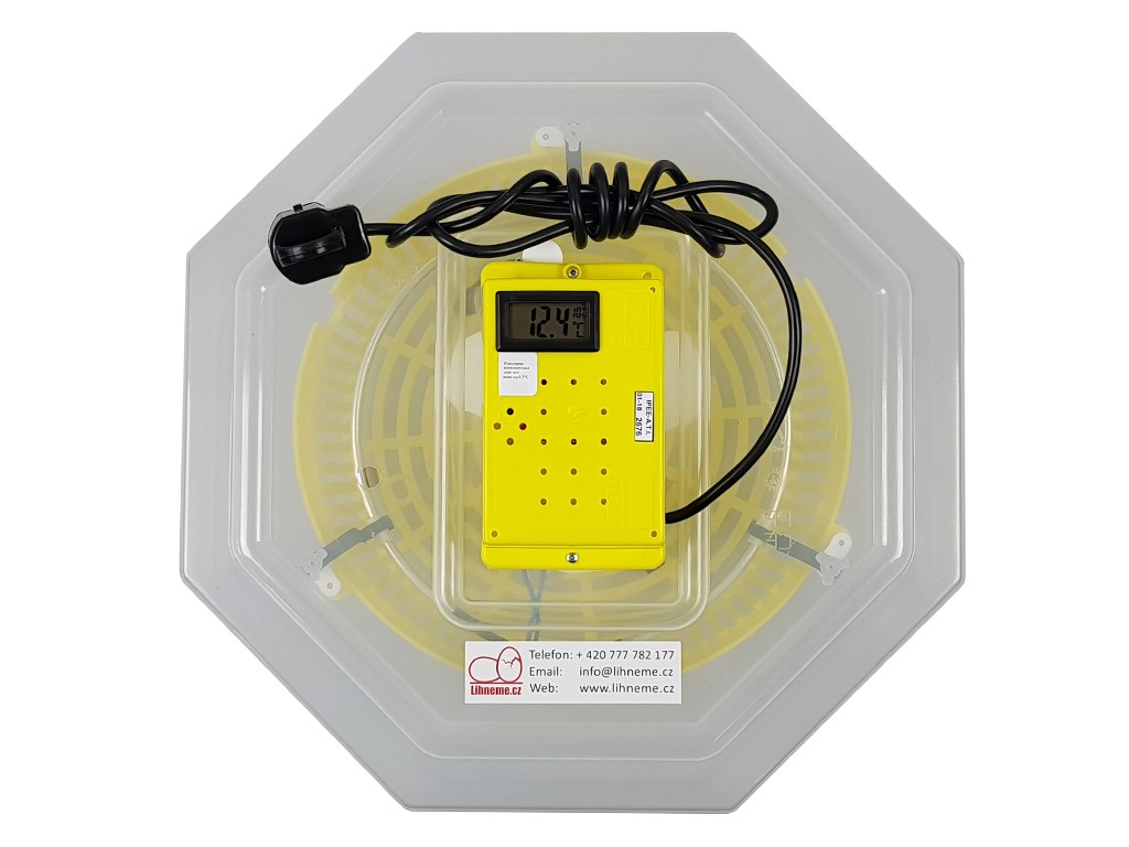 Temperaturę można ustawić i ewentualnie regulować w zakresie od 35 do 40°C za pomocą ręcznego regulatora na Elektroniczne jednostki sterujące. Panel wyposażony jest w cyfrowy wyświetlacz ze wskaźnikami temperatury i wilgotności , a po lewej stronie obrotowy regulator do ustawienia odpowiedniej temperatury w inkubatorze.