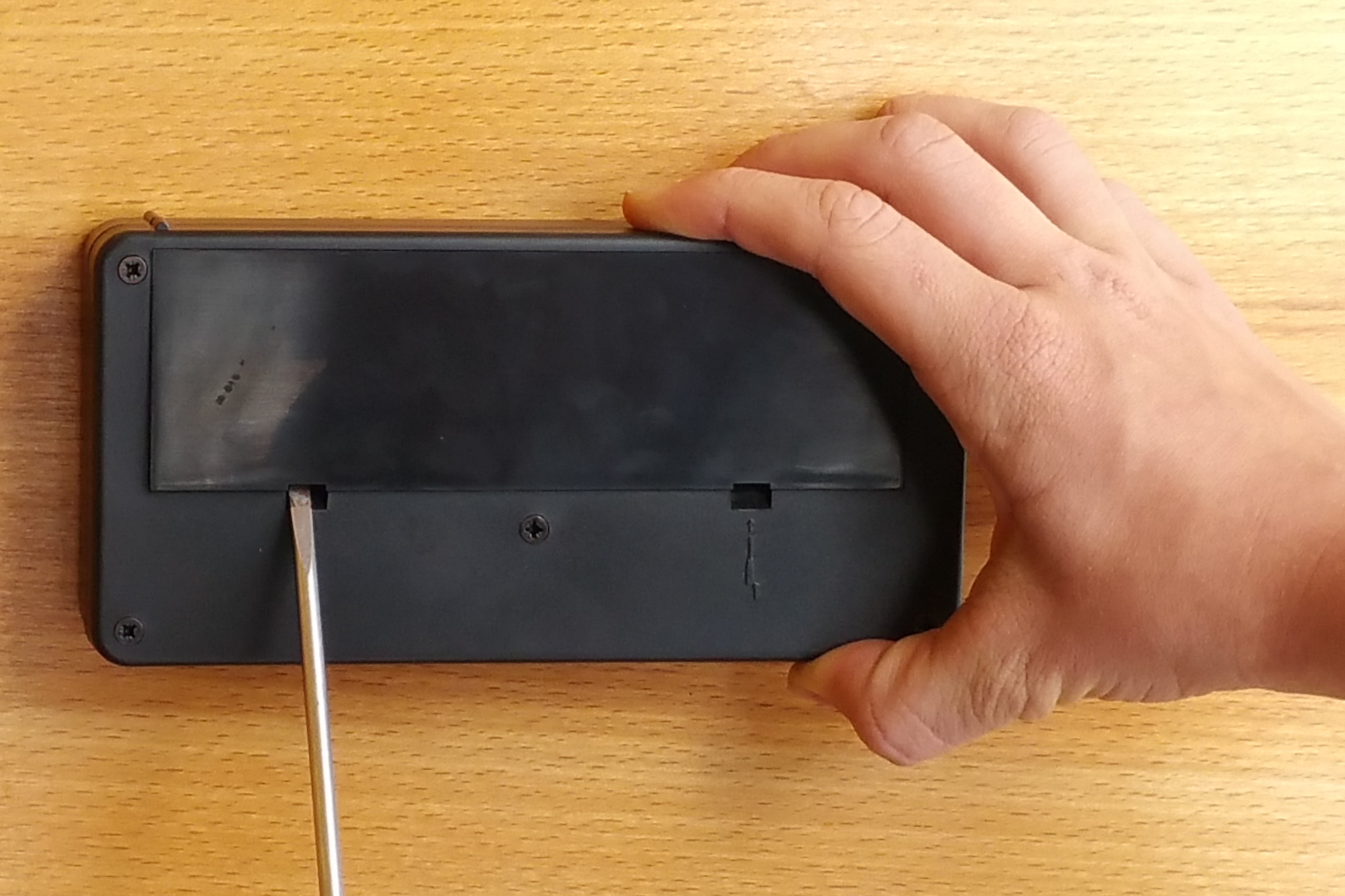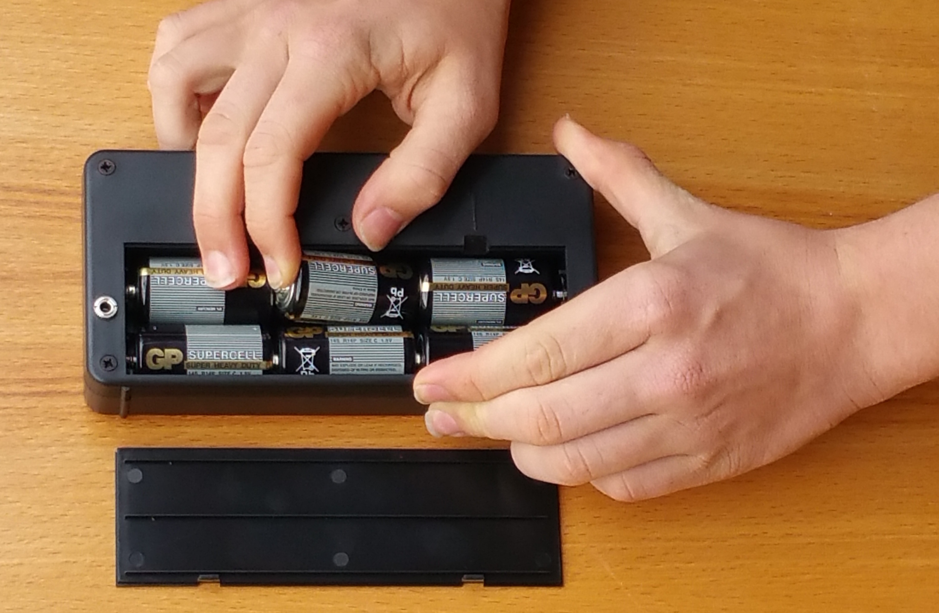 3. W przypadku zasilania bateryjnego, użyj śrubokręta lub podobnego przedmiotu, aby otworzyć tylną pokrywę urządzenia i włożyć 6 baterii do urządzenia. Zwróć uwagę na biegunowość!