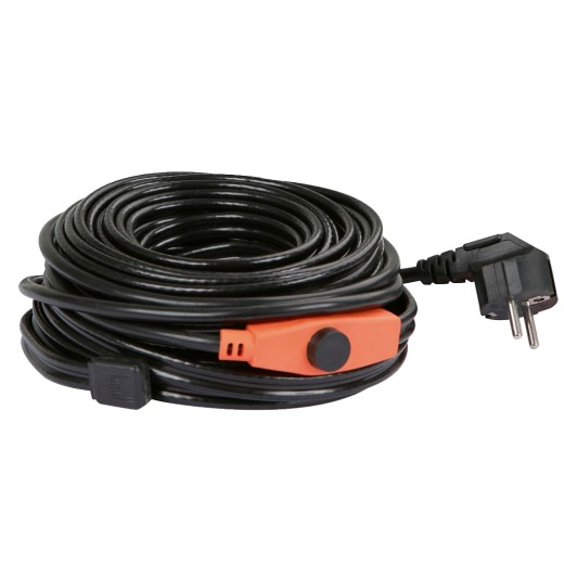 Przewód grzejny z termostatem, odporność na zamarzanie do -45°C, do rur metalowych i plastikowych, temperatura przełączania +5°C, temperatura przełączania +13°C, stopień ochrony IPX7, przetestowany przez VDE, wytrzymałość mechaniczna M1, napięcie 230V, moc 192W, długość przewodu grzejnego 12m, długość przewodu zasilającego 2m.