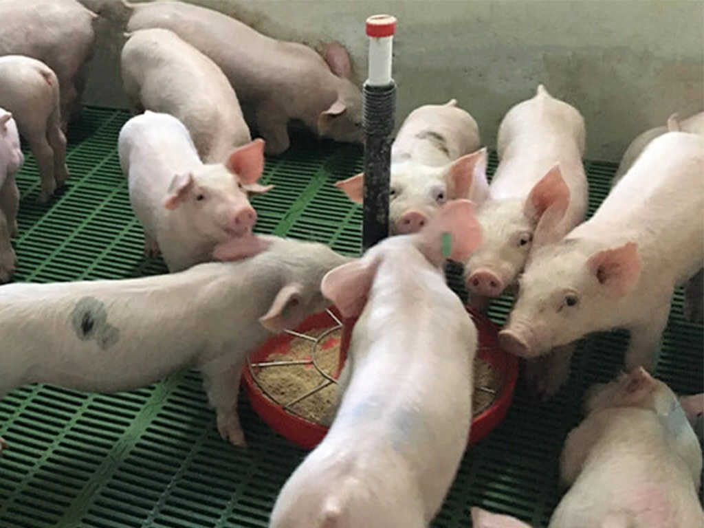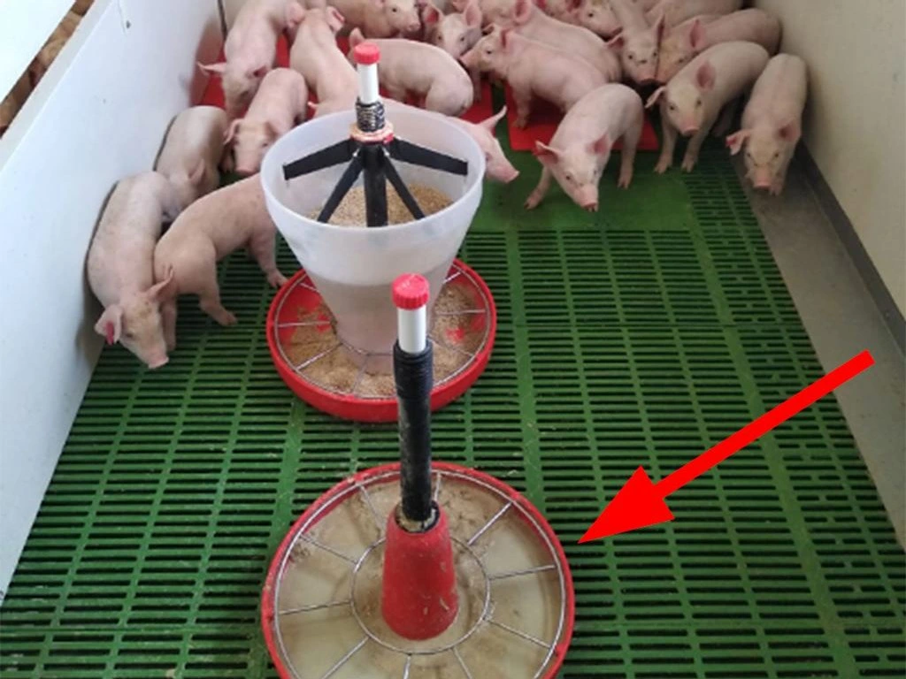 Automatyczny podajnik karmy do karmienia prosiąt w okresie odsadzania, prosty montaż na kratce , łatwa konserwacja, 10 stanowisk do karmienia, pojemność miski 9 l, średnica miski 42,5 cm, wysokość podajnika 68 cm.
