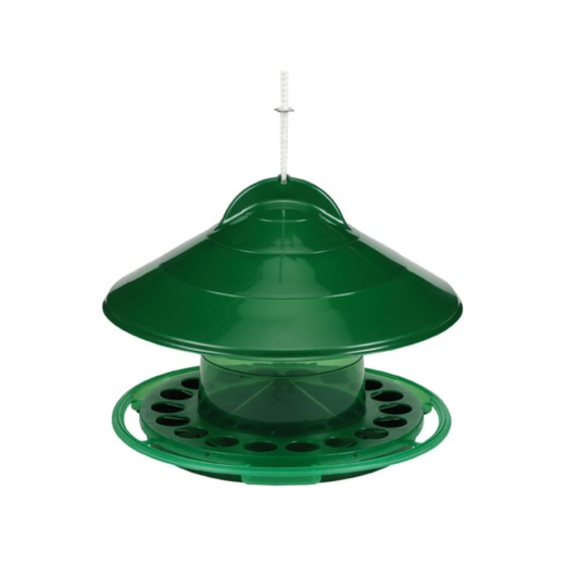 Karmnik dla ptaków Hopper , z pokrowcem przeciwdeszczowym, można postawić na ziemi lub zawiesić , 18 otworów, dla większych ptaków , wymiary Ø 305 x 230 mm .