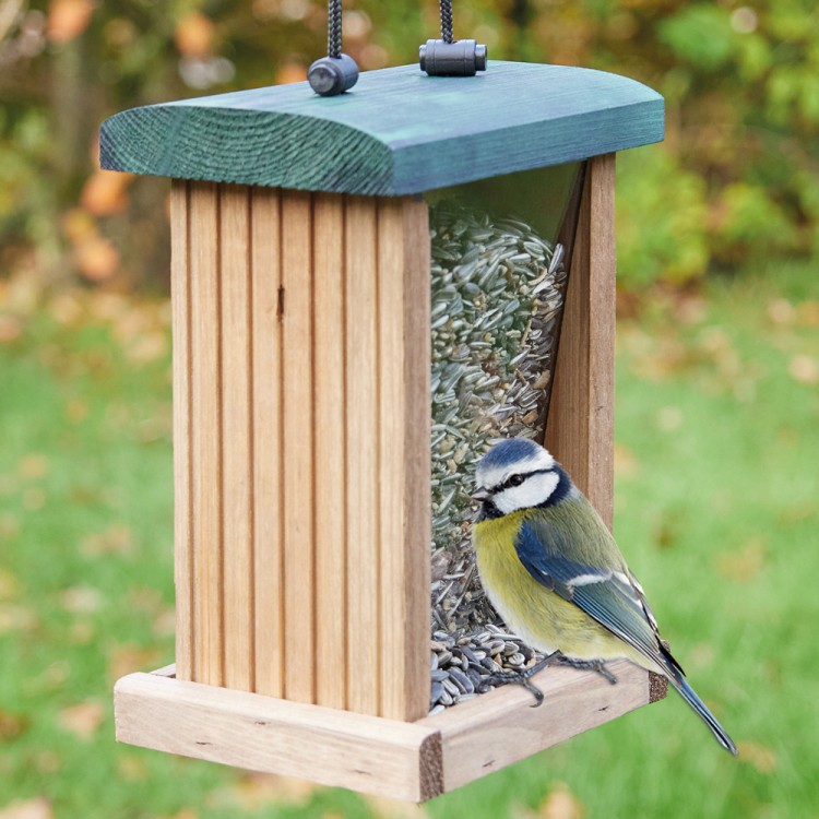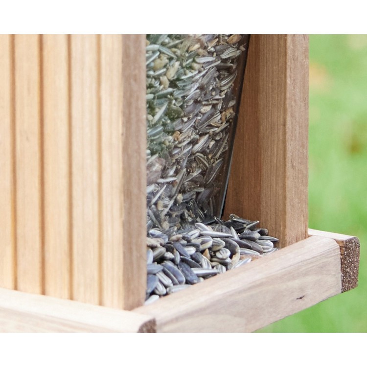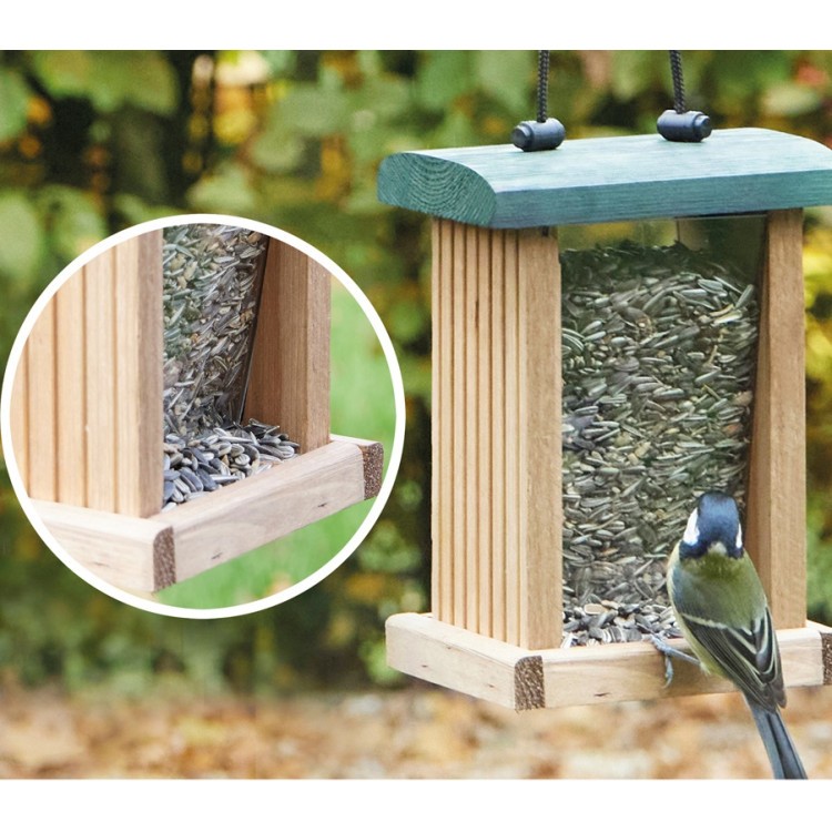 Wytrzymały karmnik można szybko i łatwo napełnić dużą ilością karmy – dzięki czemu nie trzeba go ciągle uzupełniać. Wystarczy zdjąć dach karmnika i napełnić go nową karmą dla ptaków. Dzięki wytrzymałym panelom z pleksiglasu widać, kiedy karma wymaga uzupełnienia. Małe ptaki, takie jak wróble i rudziki, mogą usiąść na bocznej krawędzi i wygodnie dziobać ziarno.
