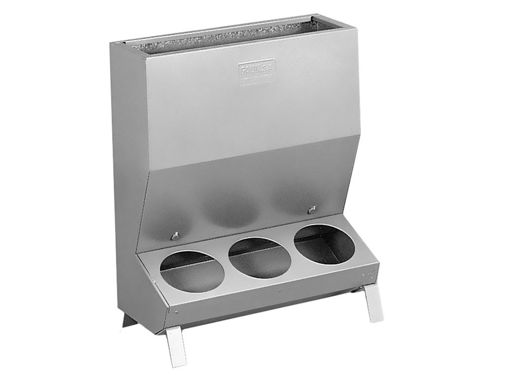 Karmnik dla prosiąt, trzystanowiskowy, lejowy, wykonany z blachy ocynkowanej , regulowany otwór na paszę , lej zasypowy na 25 kg paszy, wymiary 46x24x54 cm.