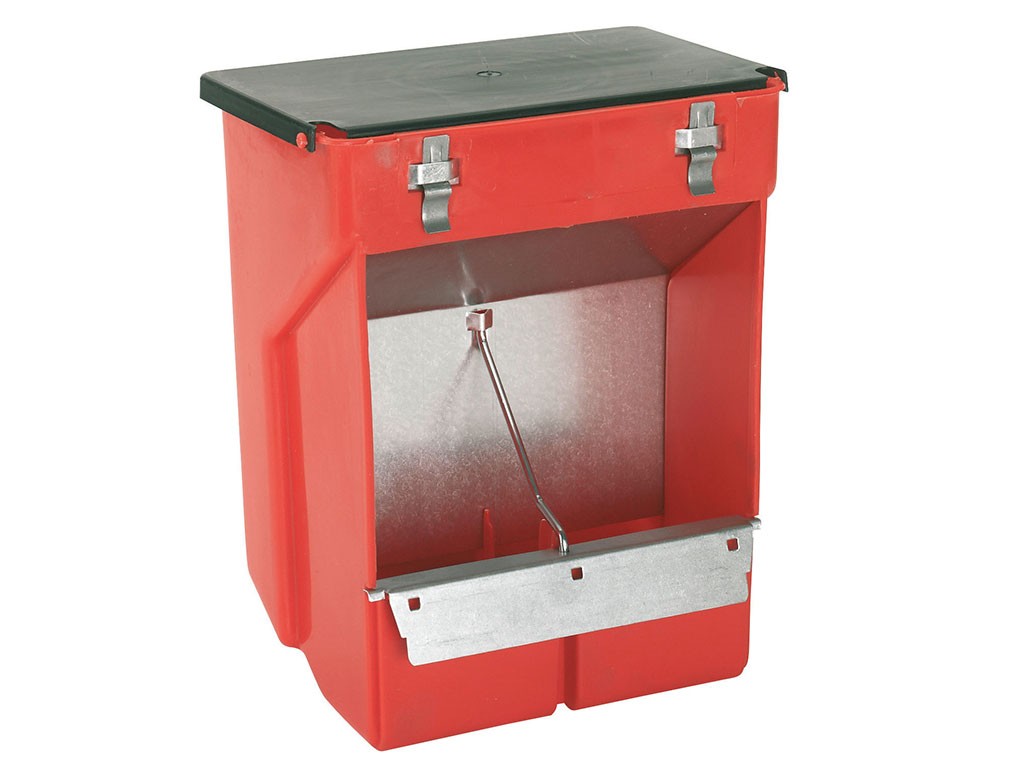 Karmnik wiszący dla królików , pojemnik na granulki i ziarna, do zawieszania w klatkach z pokrywą, z otworami wentylacyjnymi , wykonany z wysokiej jakości tworzywa sztucznego, ocynkowany z zabezpieczeniem przed gryzoniami, z 2 przegrodami i pojemnością 3,5 l .