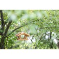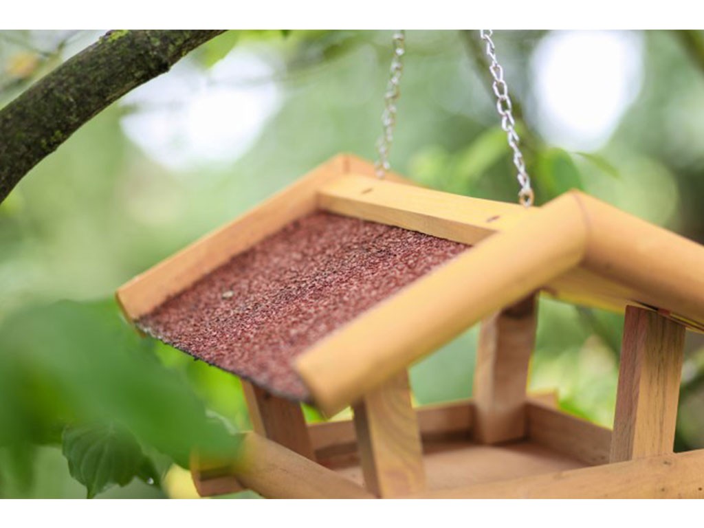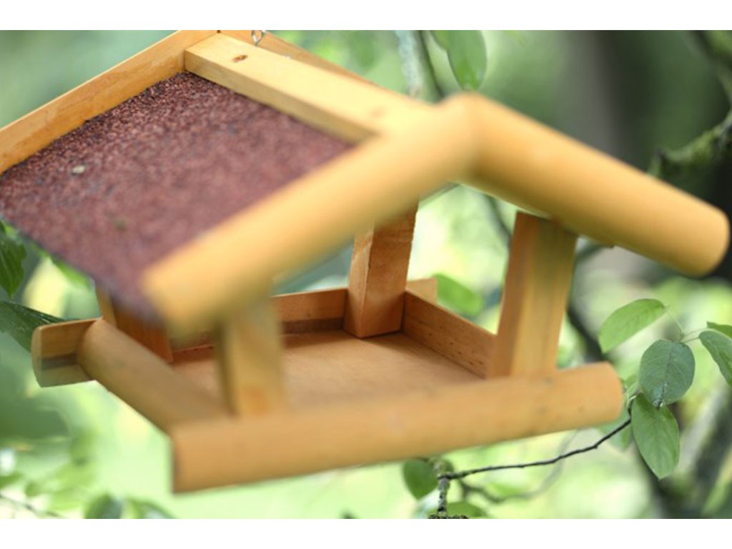 Karmnik dla ptaków, lakierowane drewno świerkowe, dach z papy bitumicznej , trwały metalowy łańcuch do zawieszania, większy daszek chroniący przed deszczem, wymiary 29x28x18 cm.