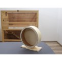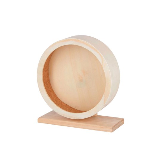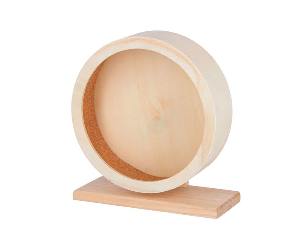 Karuzela dla chomików i małych gryzoni, wykonana z drewna, szeroka podstawa, warstwa korka na wewnętrznej powierzchni , zamknięta tylna ścianka , wymiary 24,5x22x5,8 cm, średnica 22 cm.