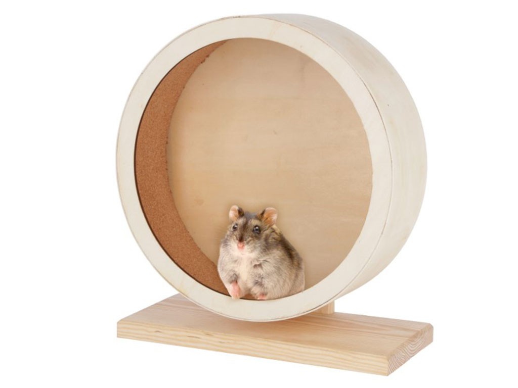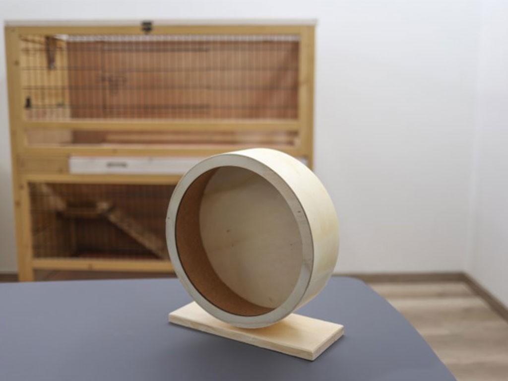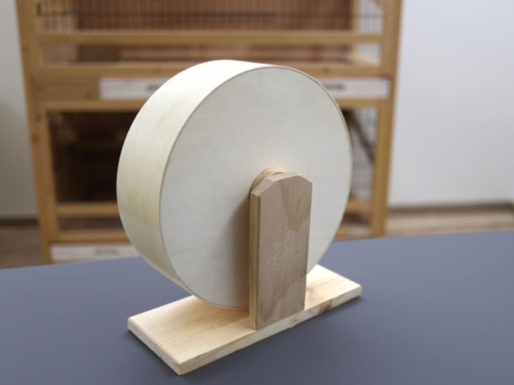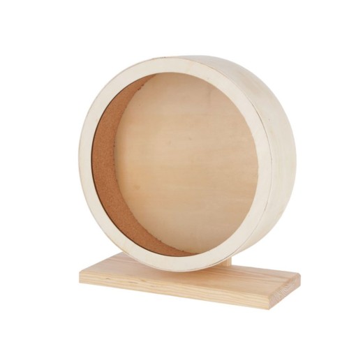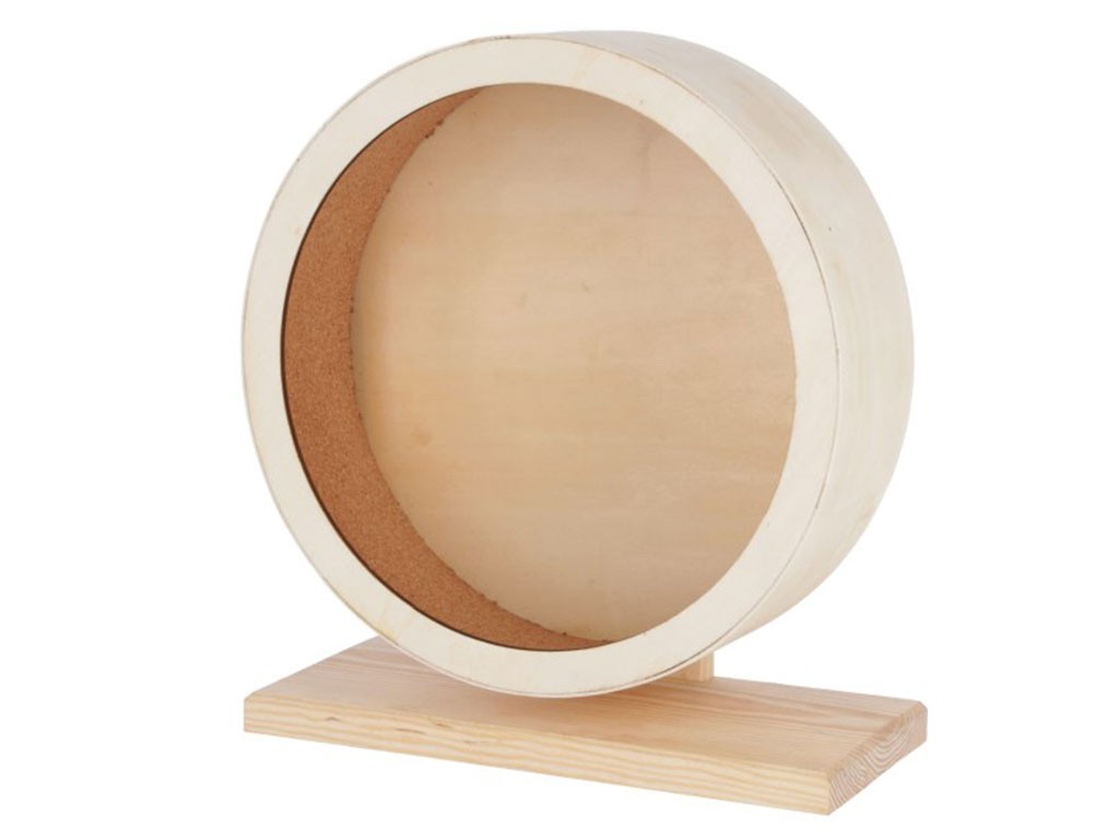 Karuzela dla chomików i małych gryzoni, wykonana z drewna, szeroka podstawa, warstwa korka na wewnętrznej powierzchni , zamknięta tylna ścianka , wymiary 31,5x29x8 cm, średnica 29 cm.